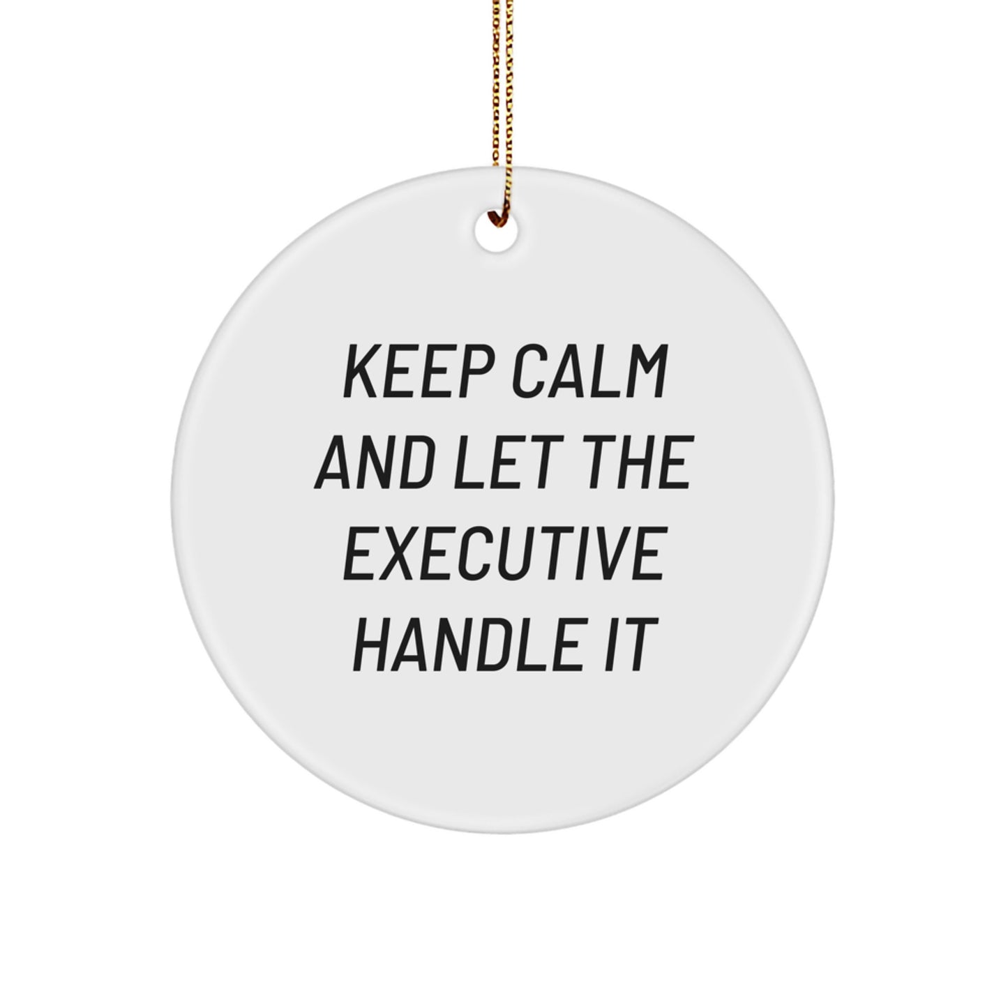 - Brighten up your holiday decor with this funny 'Keep Calm And Let The Executive Handle It' circle ornament, perfect for adding a touch of humor to your tree or mantel.
