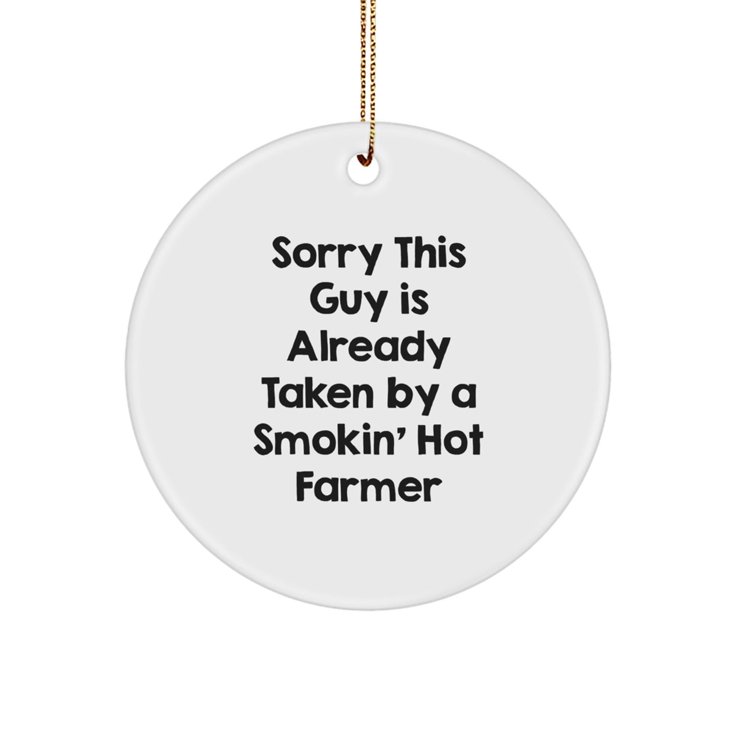 Get ready to ignite the farm with this hilarious quote! 'Sorry This Guy Is Already Taken By A Smokin' Hot Farmer' is the ideal gift for the farmer in your life. This Circle Ornament is a unique and thoughtful present for any occasion, especially Christmas.