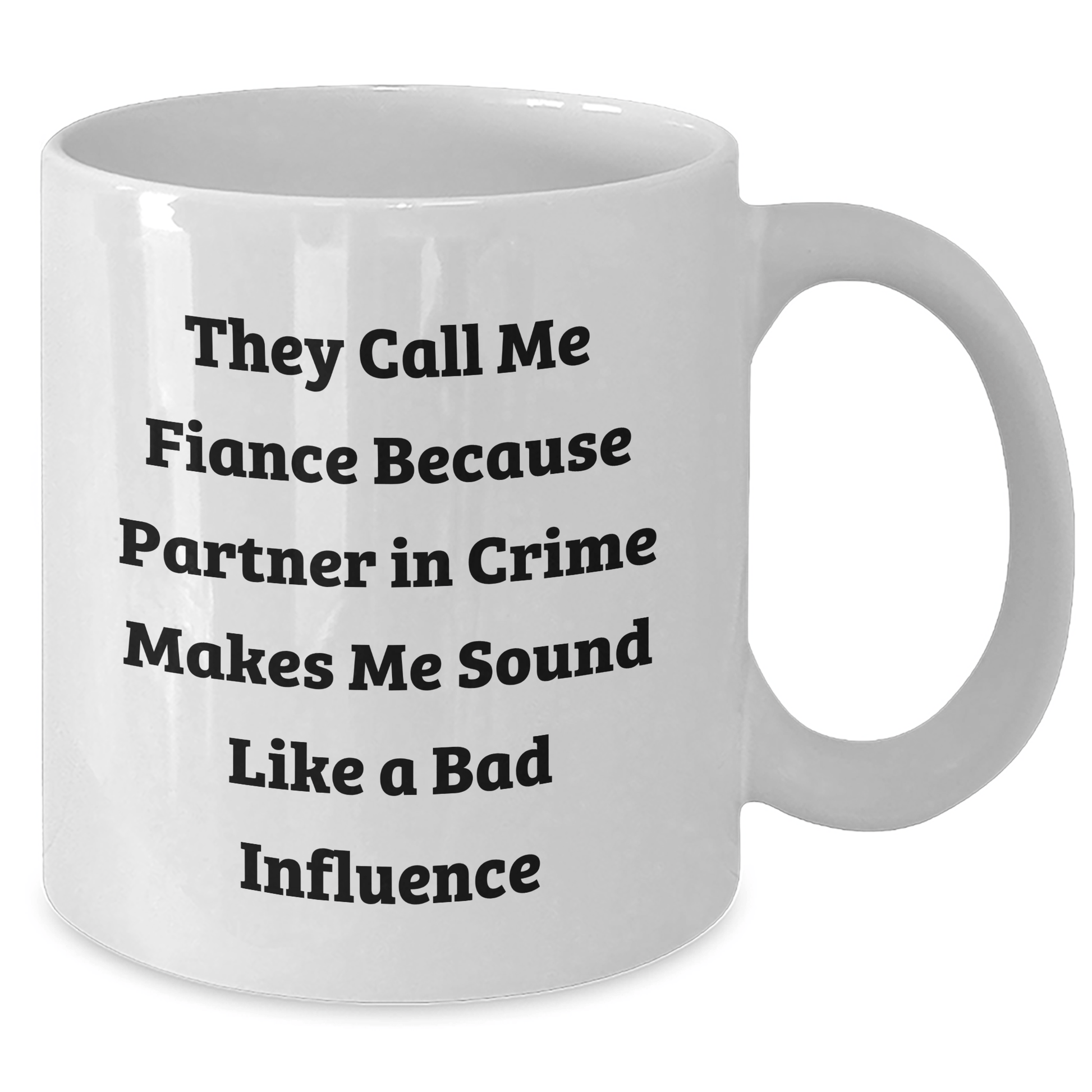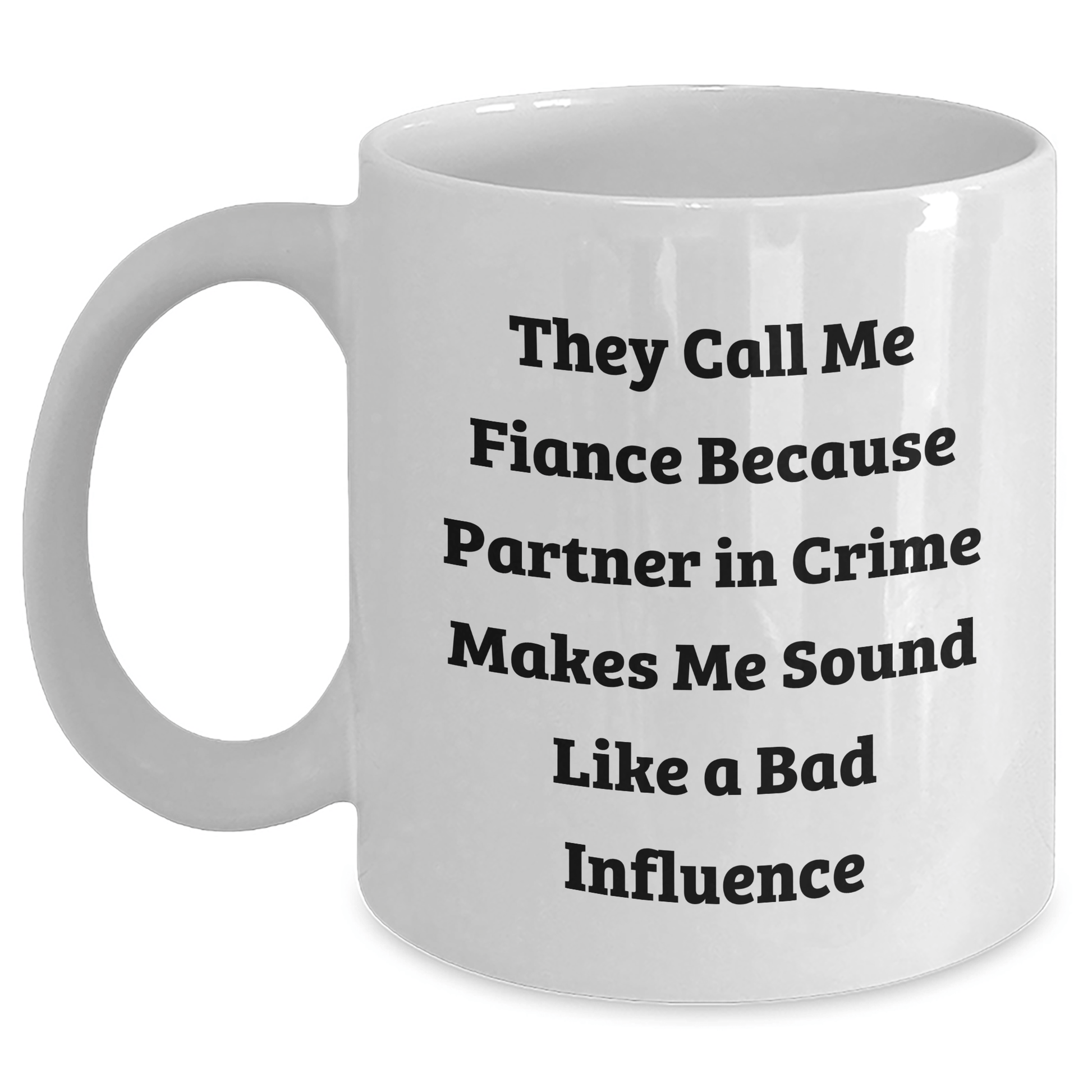 - Give the gift of laughter and love with this funny Fiance coffee mug, perfect for graduates and partners in crime alike. The quote they call me Fiance because partner in crime makes me sound like a bad influence is a great way to express your playful and humorous side.
