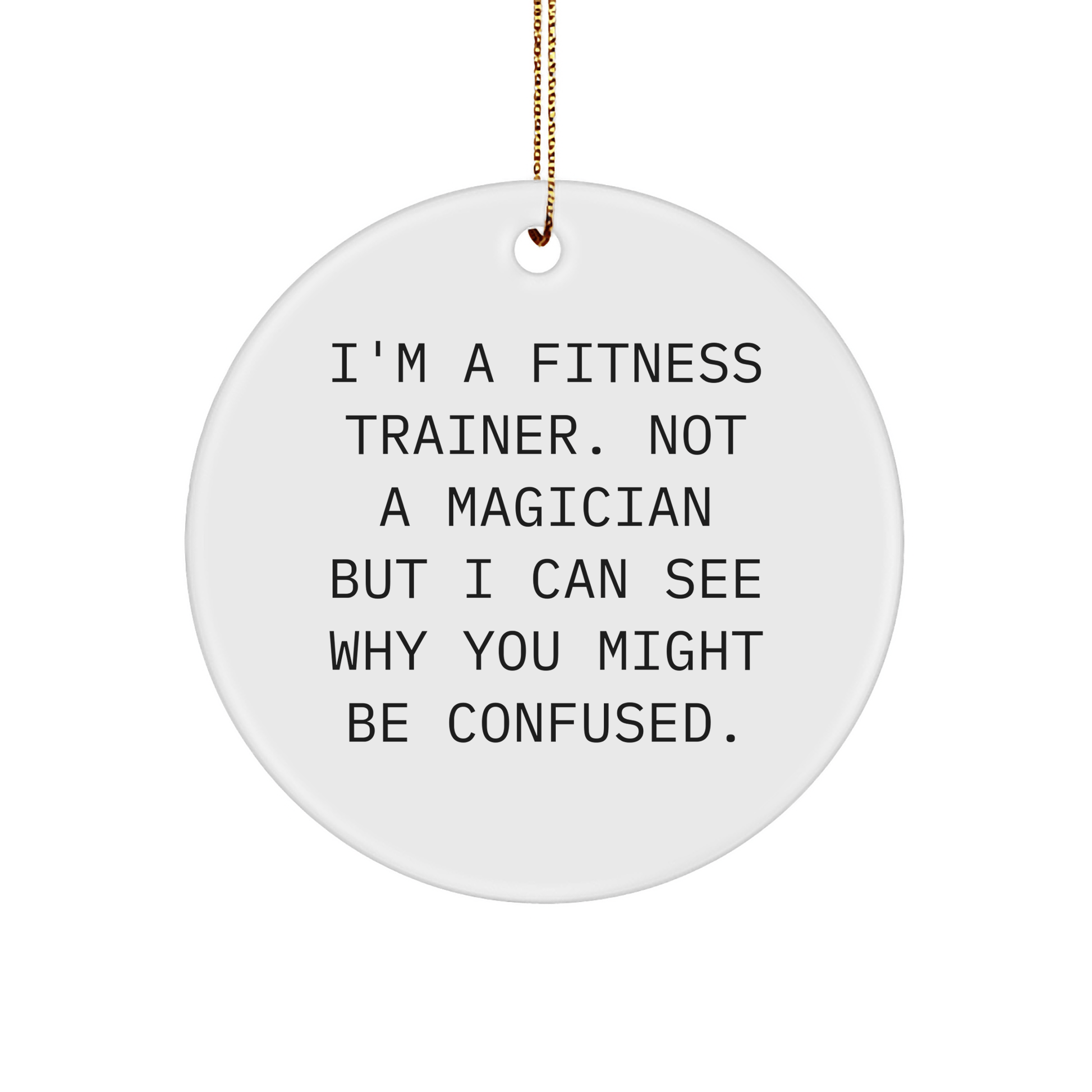 Are you looking for a unique gift for your favorite Fitness Trainer? Look no further! This hilarious 'I'm A Fitness Trainer. Not A Magician But I Can See Why You Might Be Confused.' Circle Ornament is the perfect present for any Fitness Trainer enthusiast. Made from sturdy MDF with a high-gloss plastic finish, this ornament is vibrantly printed from edge-to-edge via Sublimation, ensuring bright, vivid colors. Its lightweight and resistant to breaking, making it a great choice for households with children or pets. Ships with a festive gold cord for easy hanging, perfect for stress-free decorating. Give this thoughtful gift to your loved one and show your appreciation for their dedication to fitness. This Christmas, surprise your friends and family with a personalized gift that will bring a smile to their face. Don't miss out and make this holiday season unforgettable!
