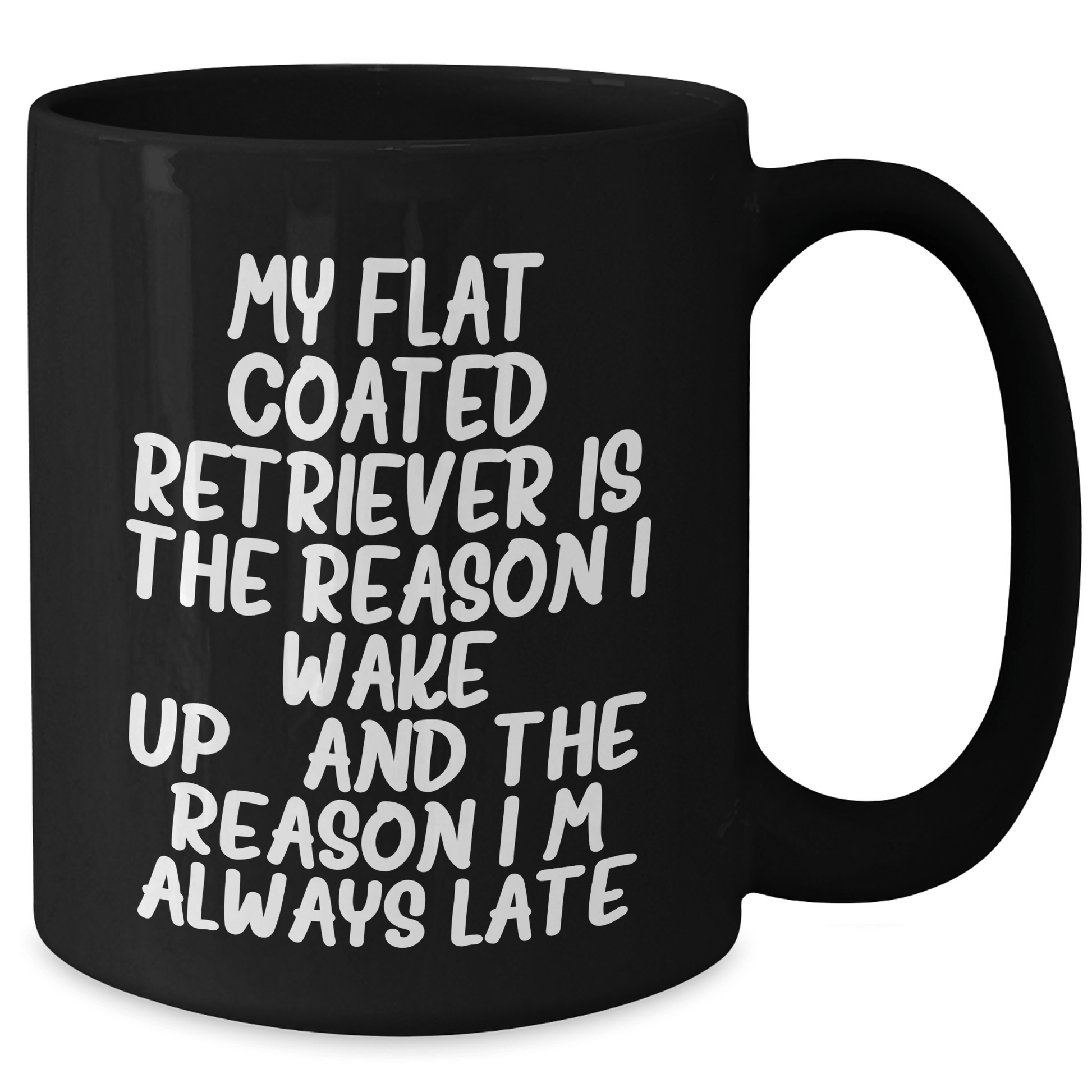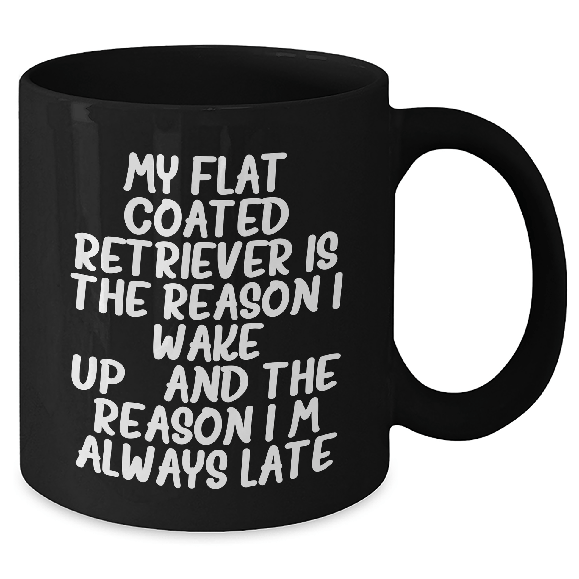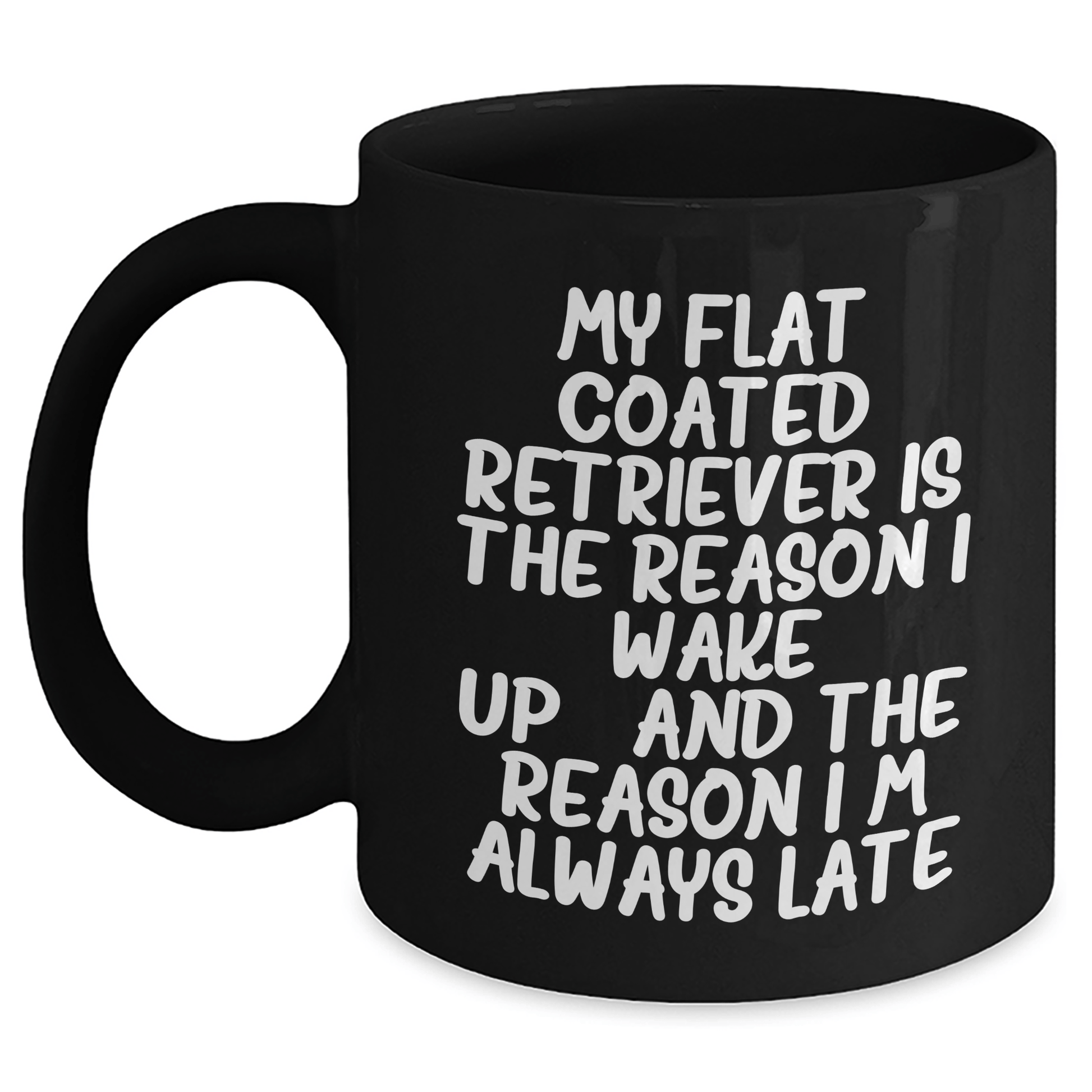 - This funny black coffee mug features a unique and humorous quote that will make anyone laugh: 'My Flat Coated Retriever Is The Reason I Wake Up...and The Reason I'm Always Late'.