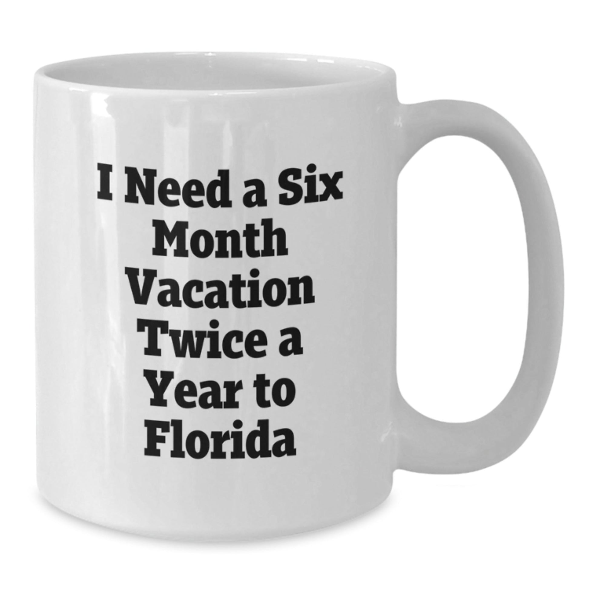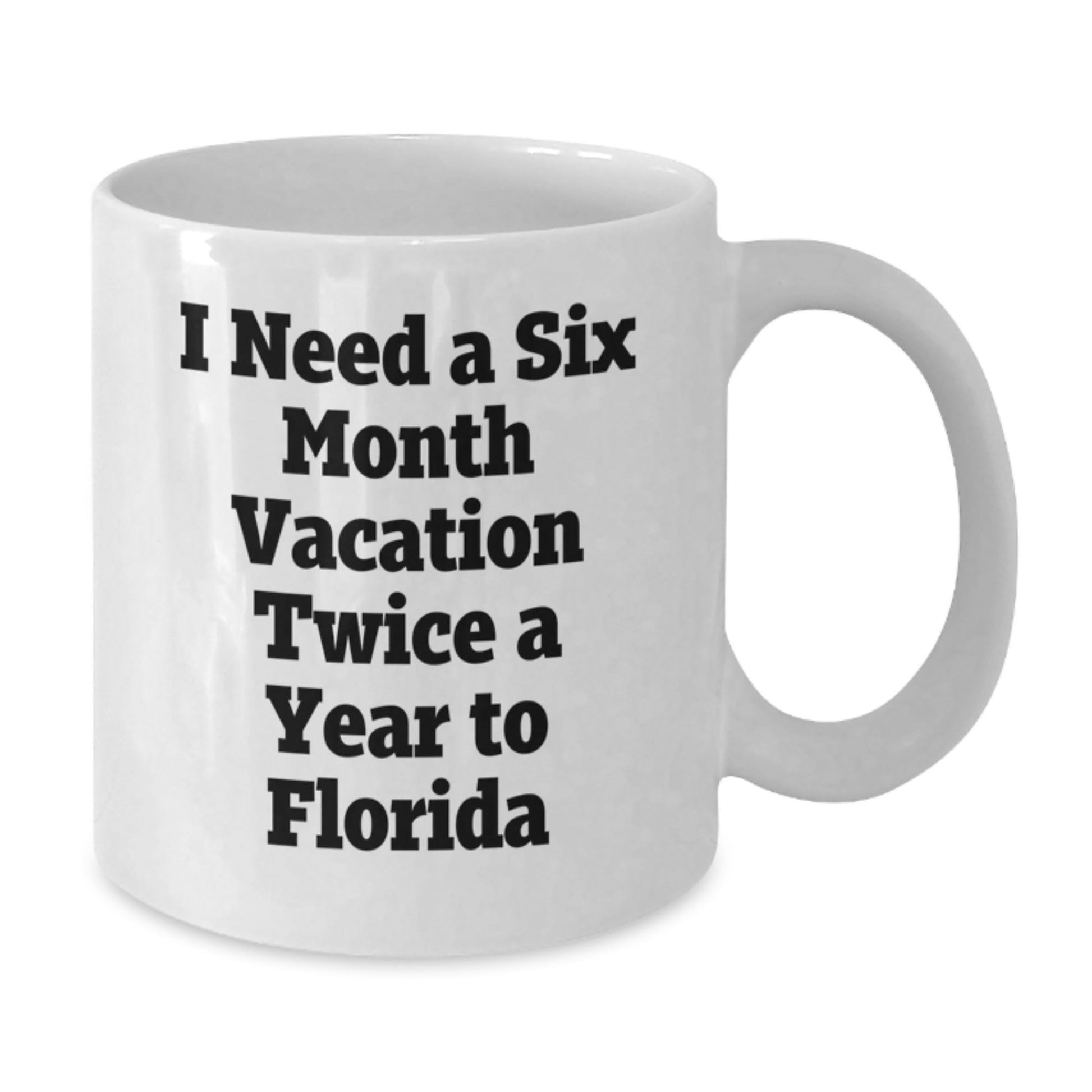 - Get ready to start your day off right with our funny white coffee mug, featuring the quote 'I Need A Six Month Vacation Twice A Year To Florida' - perfect for any Florida enthusiast!