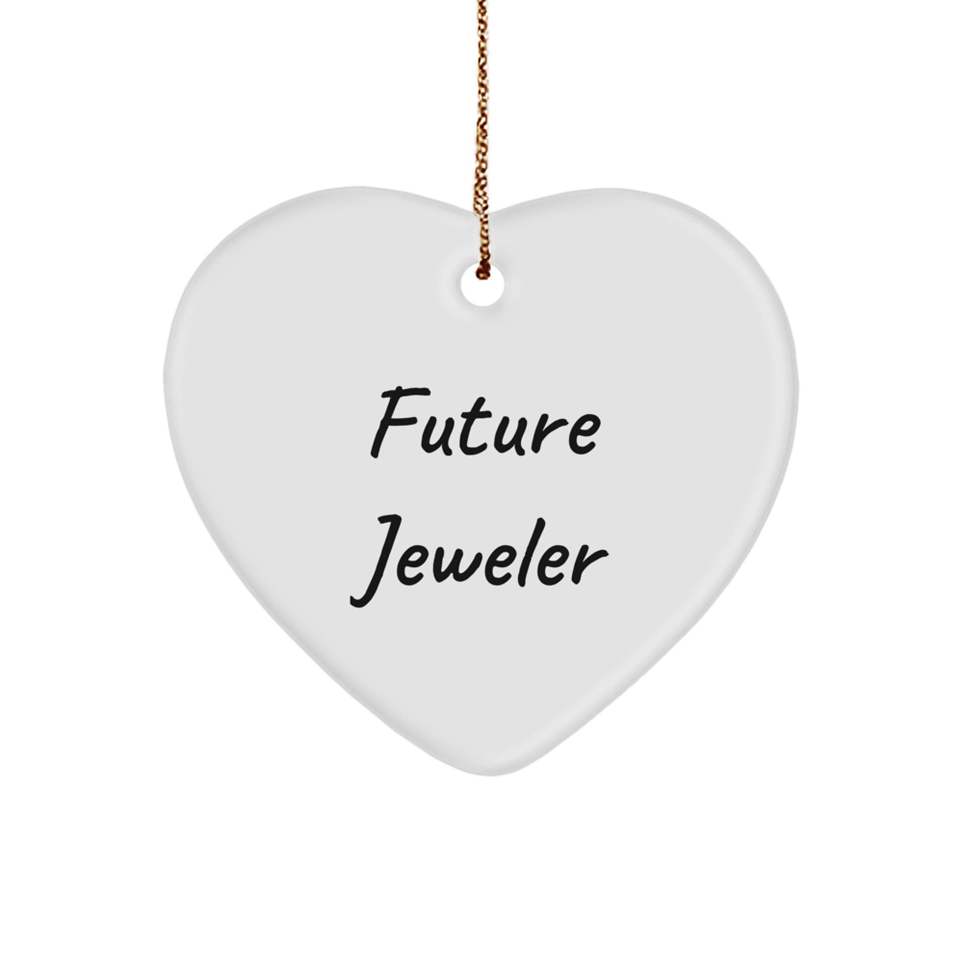 • This heart-shaped ornament is the ideal gift for a future jeweler, featuring a vibrant quote 'Future Jeweler' that's printed from edge-to-edge via sublimation, ensuring bright and vivid colors. Made with sturdy MDF and a high-gloss plastic finish, this ornament is lightweight and resistant to breaking, making it ideal for households with children or pets. Whether you're shopping for a friend, family member, or coworker, this ornament is sure to bring a smile to their face.