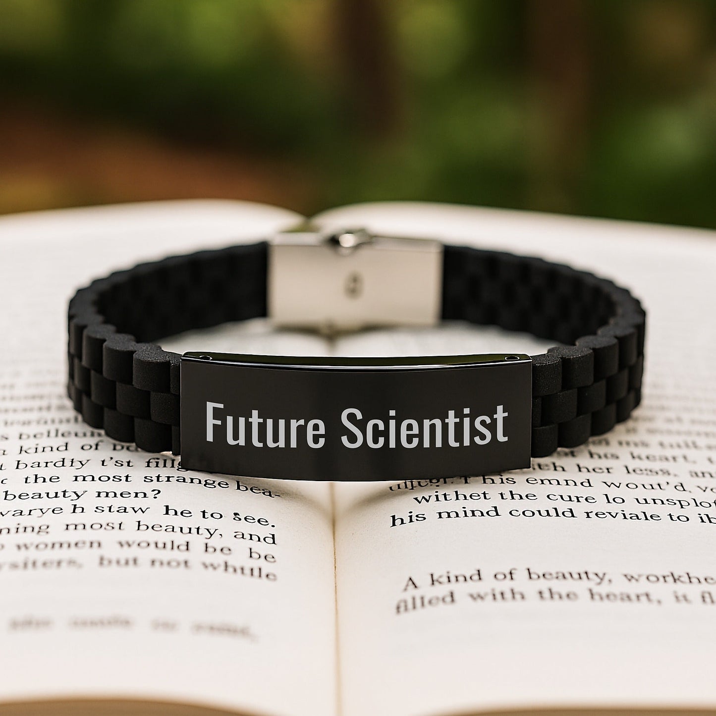 Celebrate the future of science with this unique gift! As a scientist, your loved one is dedicated to making a difference, and this Glide lock Clasp Bracelet is the perfect way to show your appreciation. The quote 'Future Scientist' is a funny and inspirational reminder of their passion and dedication to their craft. This adjustable black stainless steel and silicone bracelet is crafted with high-quality materials, ensuring it will withstand the rigors of daily wear. Whether you're a coworker, friend, or family member, this gift is sure to delight. Pair it with a card or a small memento to make it an unforgettable graduation present. This gift is perfect for any occasion, from graduation to prom, and is sure to be treasured for years to come. So why settle for a boring, generic gift when you can give something that truly speaks to the scientist in your life?