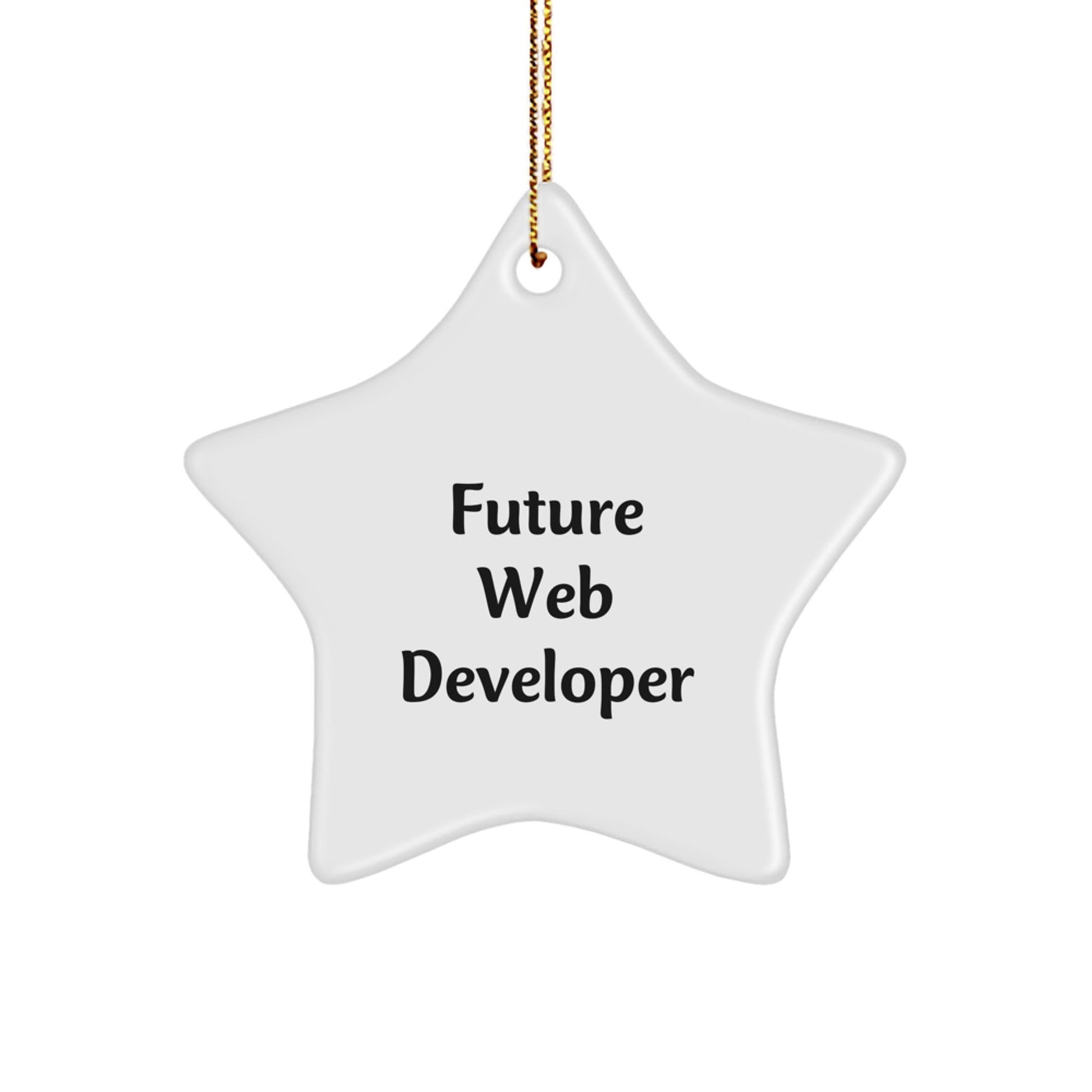 Get ready to brighten up the web developer's workday with this funny and inspirational star ornament! A great gift from family or friends, this web developer star ornament is the perfect way to express your appreciation for their hard work and dedication. Made with sturdy MDF and a high-gloss plastic finish, this ornament is lightweight, resistant to breaking, and vibrantly printed from edge-to-edge. The quote 'Future Web Developer' is a great reminder of their potential and future success. Whether you're shopping for a Christmas gift or just want to show your appreciation, this star ornament is the perfect choice.
