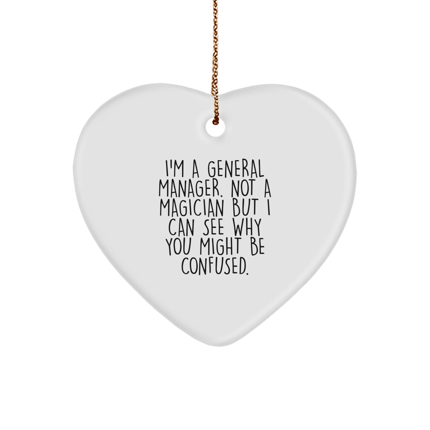 - 'I'm A General Manager. Not A Magician But I Can See Why You Might Be Confused.' - Now you can show your love for your General Manager with this unique and thoughtful Heart Ornament, perfect for Christmas decorating, 'General Manager' appreciation, or as a symbol of leadership and care. It's a great way to express your gratitude and recognition.