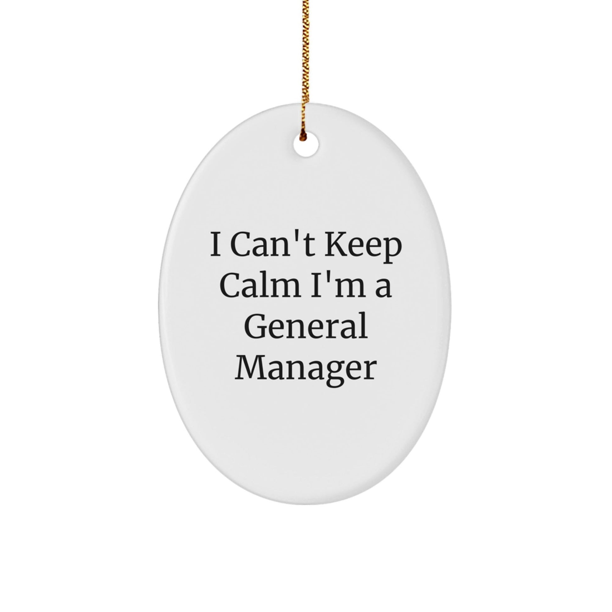 Are you a General Manager enthusiast or looking for a unique gift for the General Manager in your life? This 'I Can't Keep Calm I'm A General Manager' Oval Ornament is the perfect addition to any office or home decor. Made from sturdy MDF with a high-gloss plastic finish, this ornament is vibrantly printed from edge-to-edge via Sublimation, ensuring bright, vivid colors. Lightweight and resistant to breaking, it's a great choice for households with children or pets. Ships with a festive gold cord for easy hanging, perfect for stress-free decorating. Whether you're a funny General Manager or know someone who is, this ornament is sure to bring a smile to their face. Give it as a Christmas gift or keep it for yourself - it's a great conversation starter!
