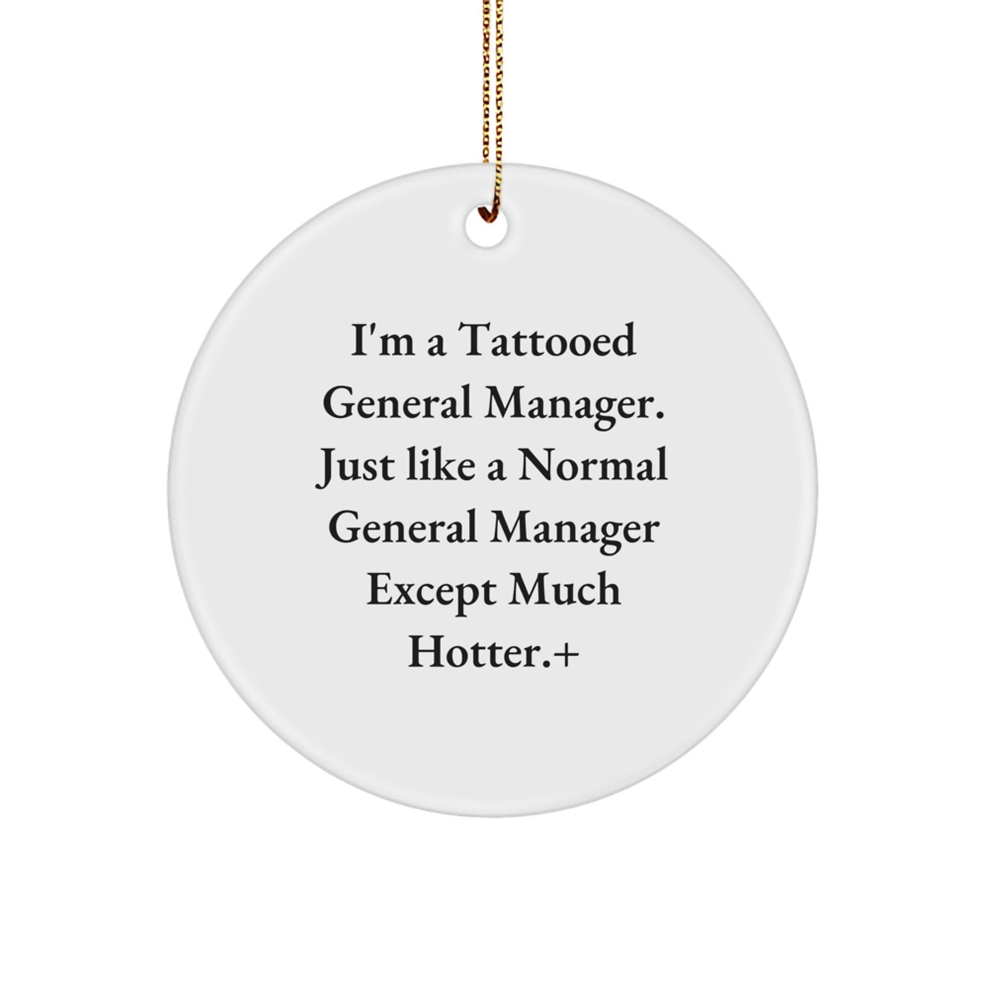 - This 'I'm A Tattooed General Manager. Just Like A Normal General Manager Except Much Hotter.' inspired Circle Ornament is a unique gift for the General Manager in your life, showcasing their flair and personality. Perfect for office decor or a thoughtful present for the holiday season.