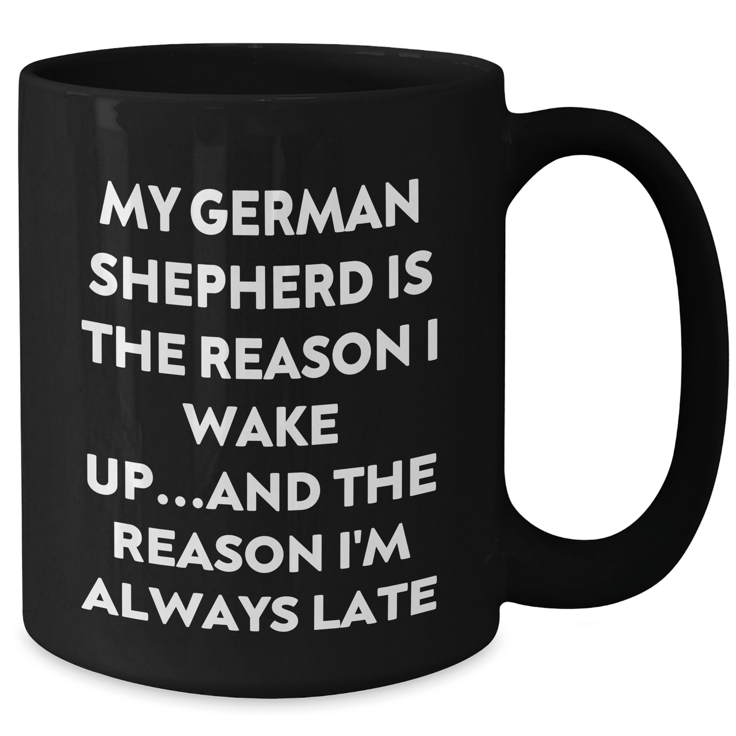 - Showcase your love for German Shepherds with this unique black coffee mug, featuring a quote that celebrates the special bond between a dog and their owner: 'My German Shepherd Is The Reason I Wake Up...and The Reason I'm Always Late'.