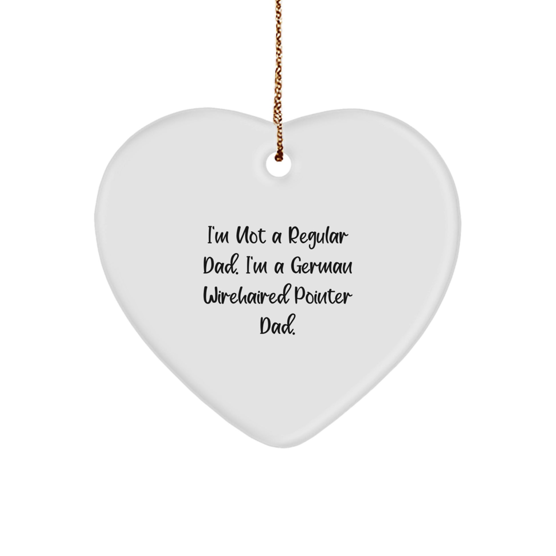 Get ready to delight German Wirehaired Pointer Dog enthusiasts with this hilarious heart-shaped ornament featuring the quote 'I'm Not A Regular Dad. I'm A German Wirehaired Pointer Dad.' Perfect for any dog lover, this unique gift is sure to bring a smile to their face. Made from sturdy MDF with a high-gloss plastic finish, this ornament is lightweight and resistant to breaking, making it a great choice for households with children or pets.