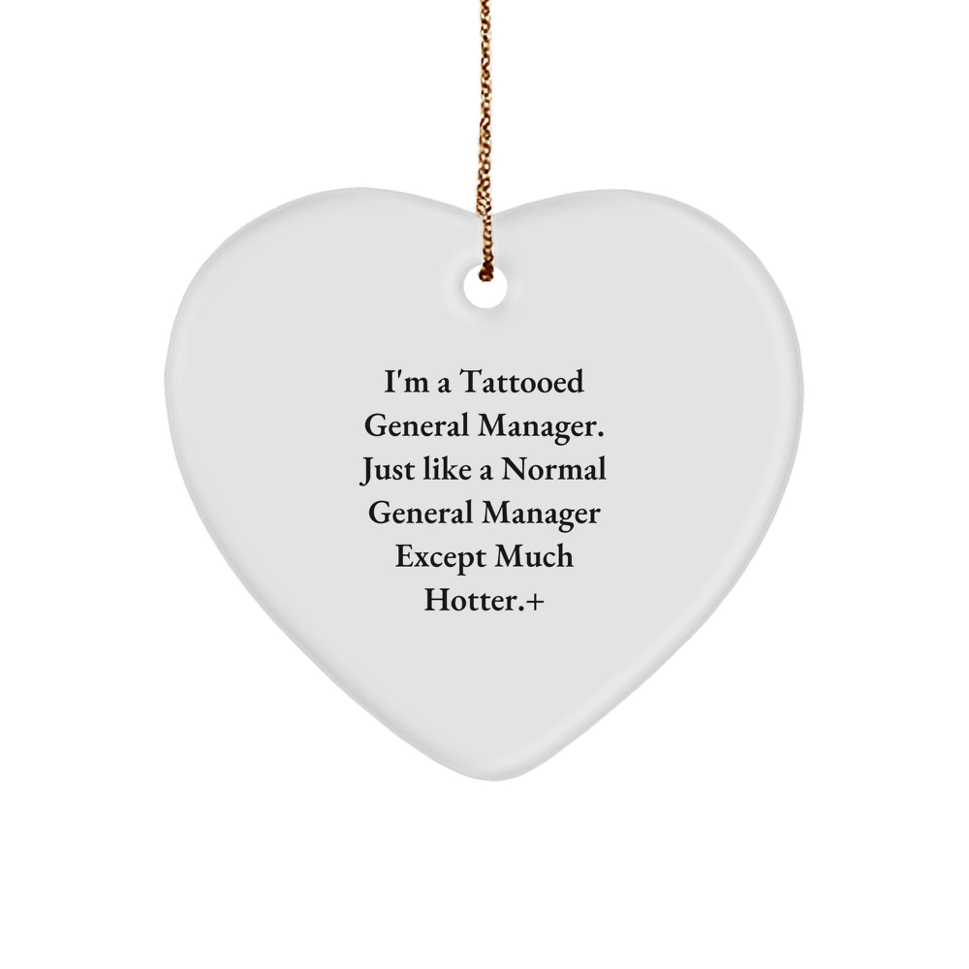 - 'I'm A Tattooed General Manager. Just Like A Normal General Manager Except Much Hotter.' - a motto that resonates with every General Manager! This heart-shaped ornament is a unique gift idea for the General Manager in your life, showcasing their personality and style. Perfect for Valentine's Day, Christmas, or any occasion to celebrate special relationships.