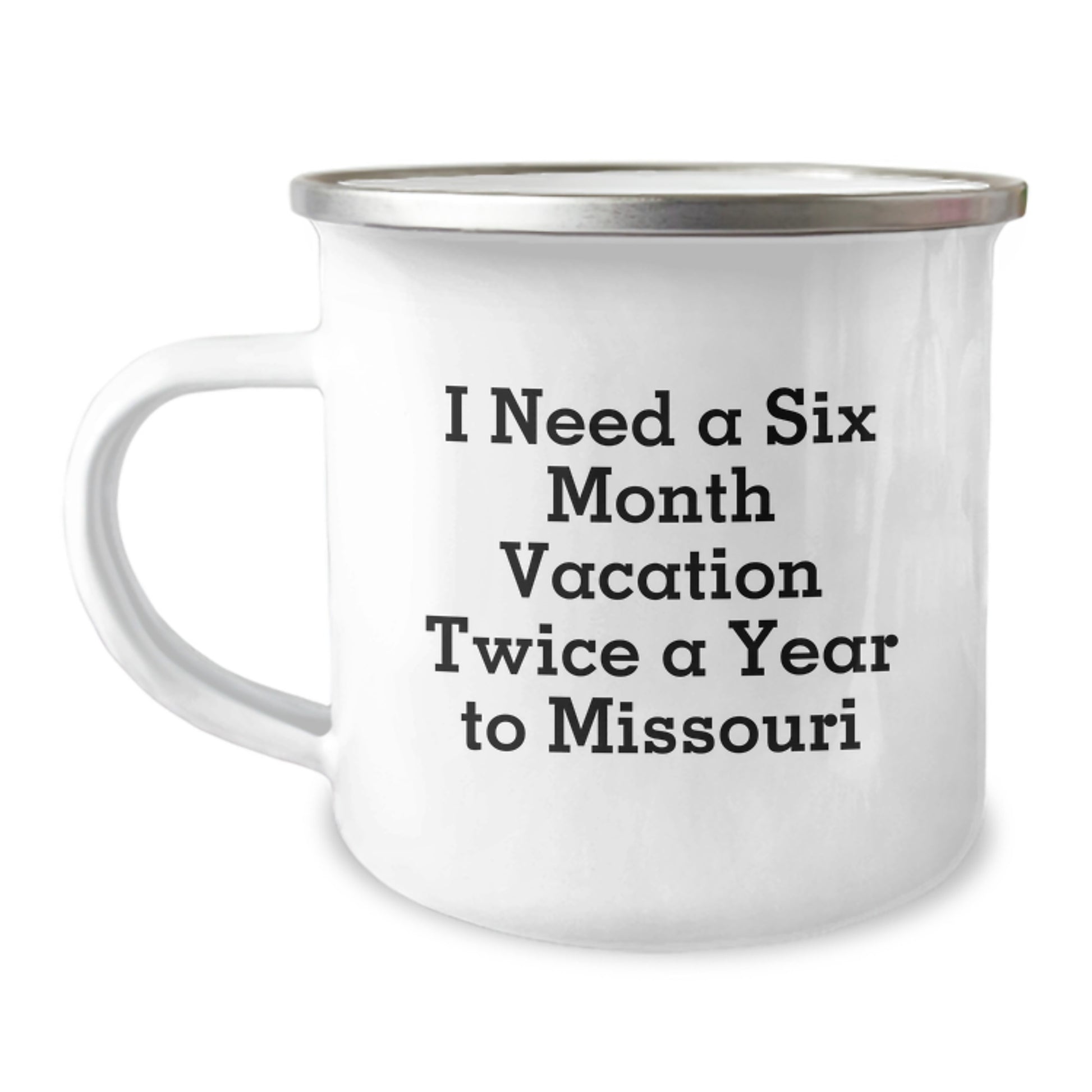 With its 12 oz capacity and stainless steel construction, this camping mug is designed to withstand the rigors of the great outdoors. The enamel finish adds a touch of elegance, making it a great addition to any camping or backyard gathering. The permanent printing won't fade after washing, ensuring the quote 'I Need A Six Month Vacation Twice A Year To Missouri' remains vibrant and eye-catching.