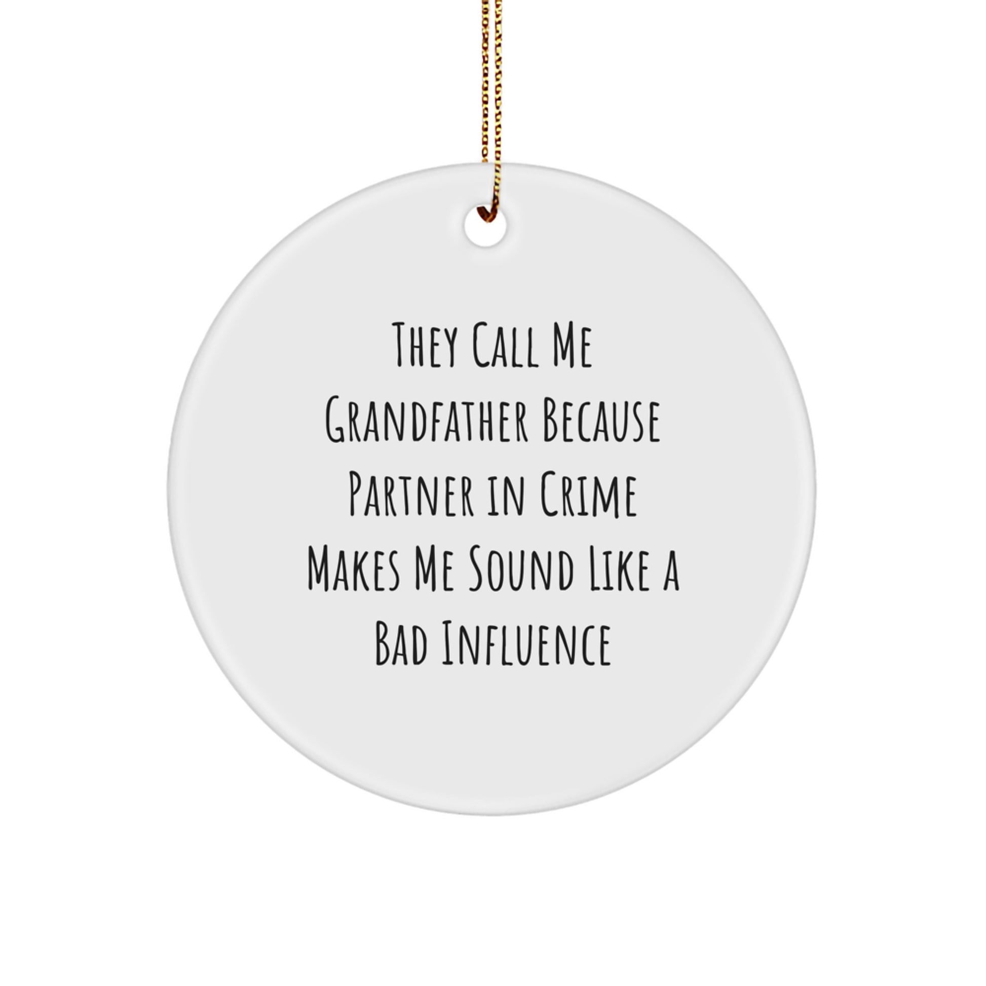 - Add a touch of humor to your Grandfather's holiday decor with this hilarious Circle Ornament featuring the quote 'They Call Me Grandfather Because Partner In Crime Makes Me Sound Like A Bad Influence'.