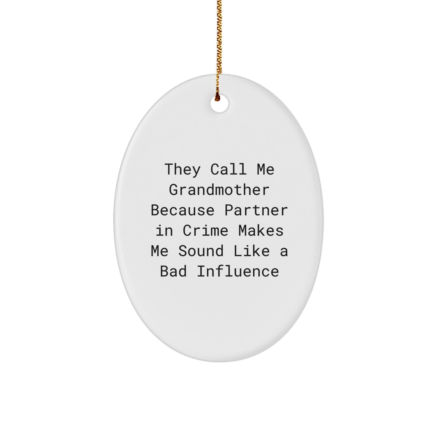 This Oval Ornament is also perfect for decorating your home or giving as a gift to your grandmother. The quote 'They Call Me Grandmother Because Partner In Crime Makes Me Sound Like A Bad Influence' is a humorous and relatable message that will resonate with any grandmother.