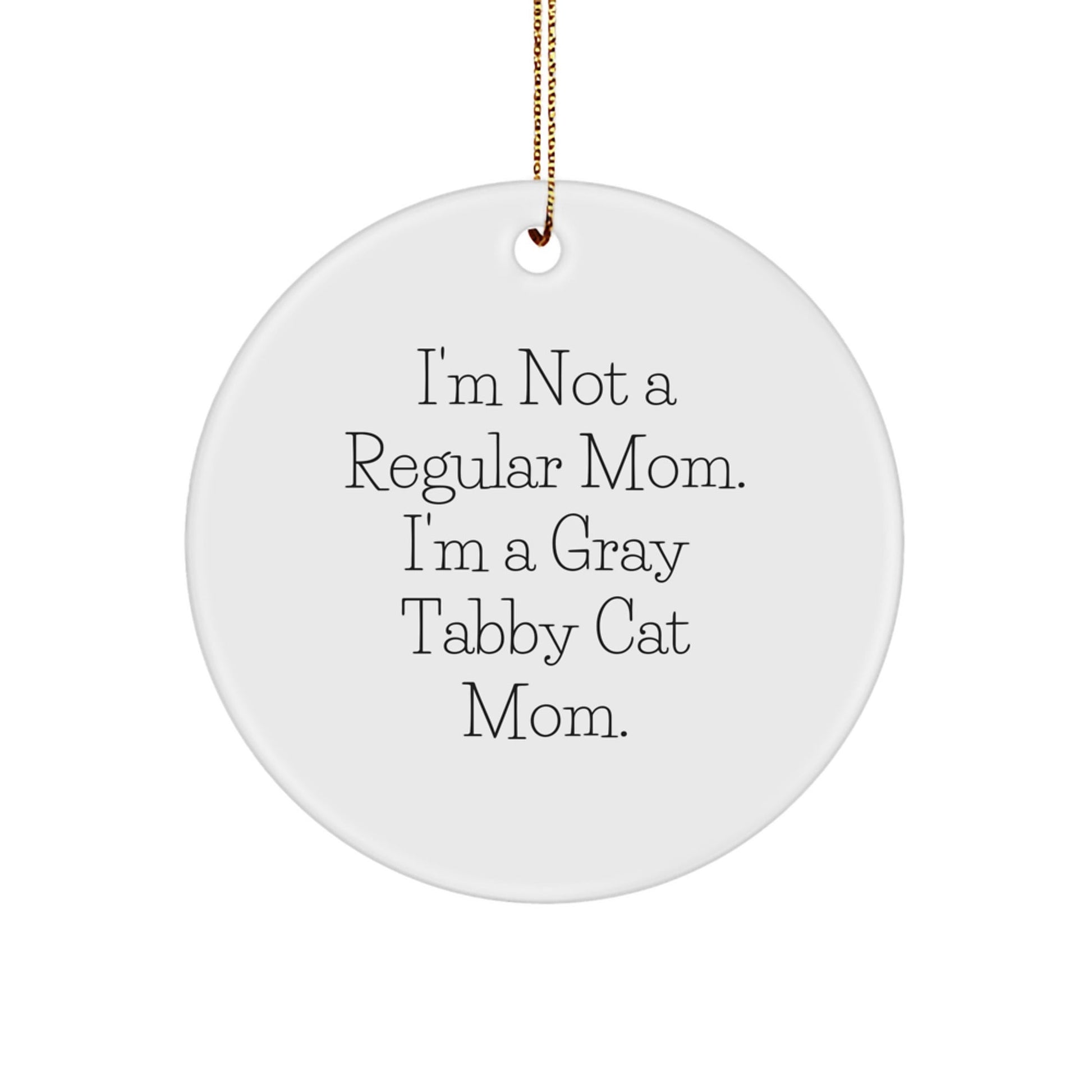 - Make a purr-fect addition to your home decor with this vibrant Gray Tabby Cat Circle Ornament, featuring a beautiful design that's sure to delight cat lovers of all ages. 'I'm Not A Regular Mom. I'm A Gray Tabby Cat Mom.' quote adds a personal touch, making it a thoughtful gift for friends and family.