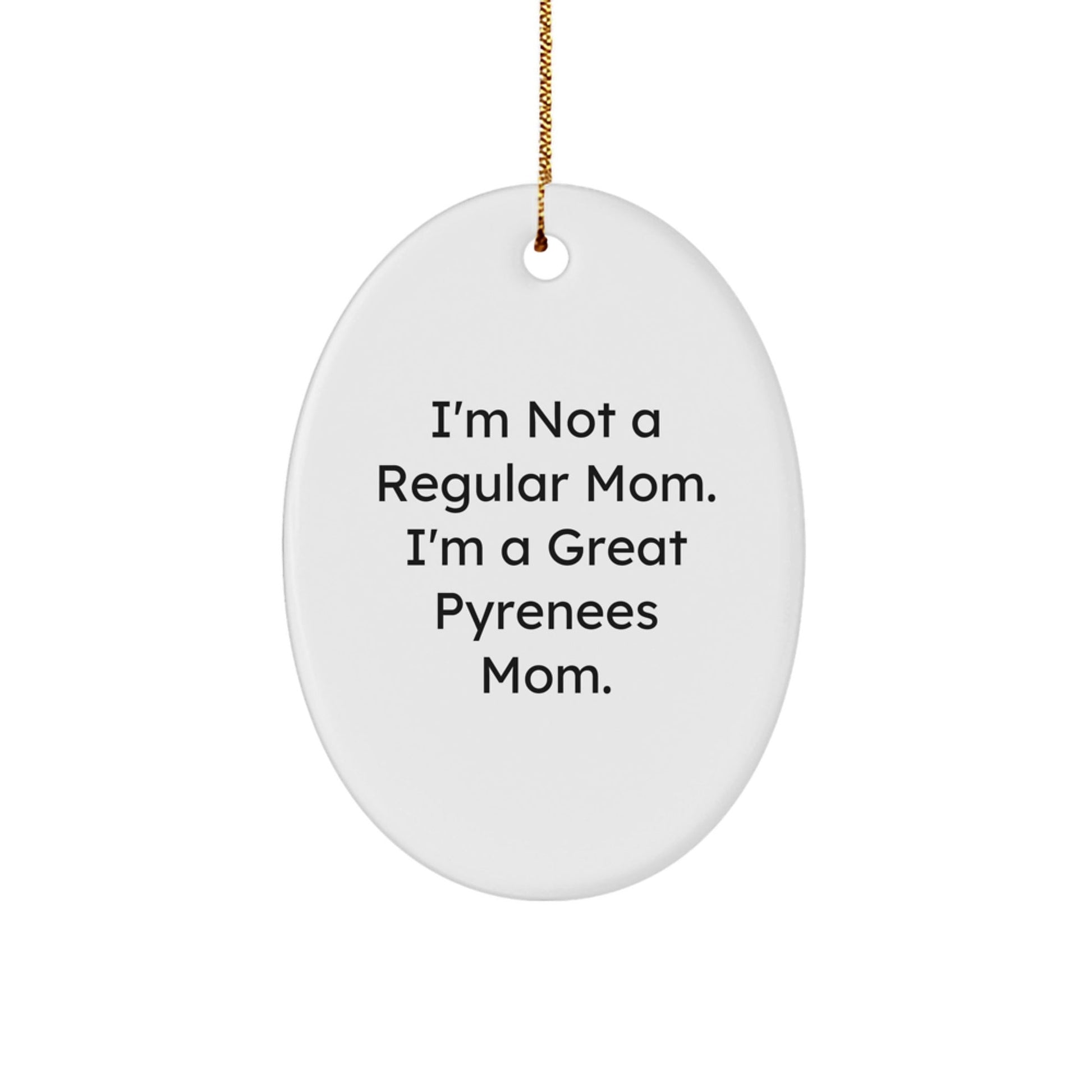 - Make a thoughtful gift for the 'I'm Not A Regular Mom. I'm A Great Pyrenees Mom.' in your life with this stunning oval ornament, crafted from durable MDF with a high-gloss plastic finish for long-lasting designs. Vibrantly printed from edge-to-edge via Sublimation, it features bright, vivid colors that will capture the beauty of the Great Pyrenees dog breed.