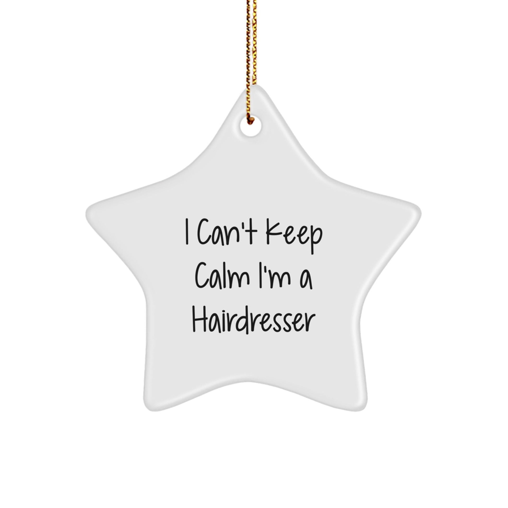 It's the ideal gift for any occasion, whether it's Christmas, birthday, or just because. And with its affordable price, it's a gift that won't break the bank. So why wait? Get your I Can't Keep Calm I'm A Hairdresser Star Ornament today and show your hairdresser how much you care!