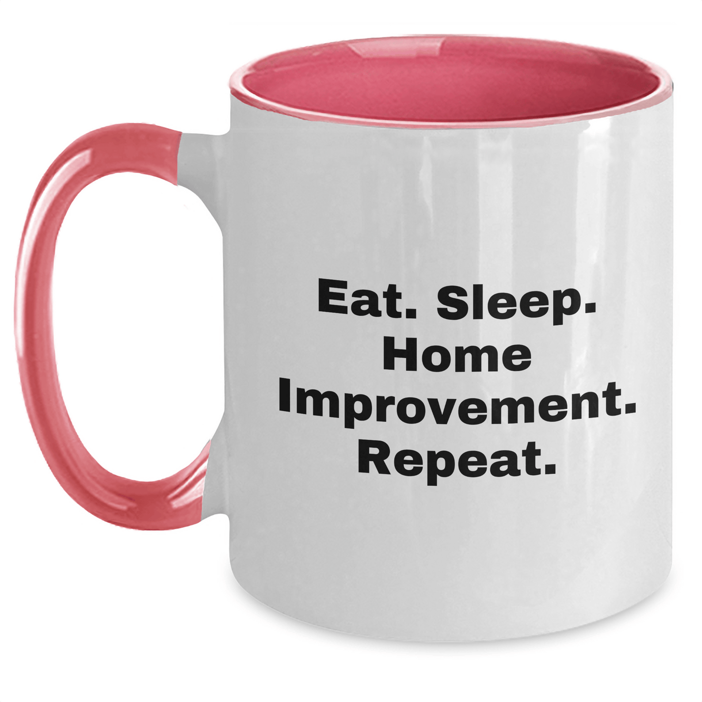 Home Improvement is not just a hobby, it's a way of life, and this mug is the perfect way to express that. The quote 'Eat. Sleep. Home Improvement. Repeat.' is a funny and relatable phrase that will surely bring a smile to the face of any Home Improvement enthusiast. This Two Tone Coffee Mug is a great gift for friends, family, or coworkers who share your passion for Home Improvement. So why wait? Treat yourself or a loved one to this unique gift today!