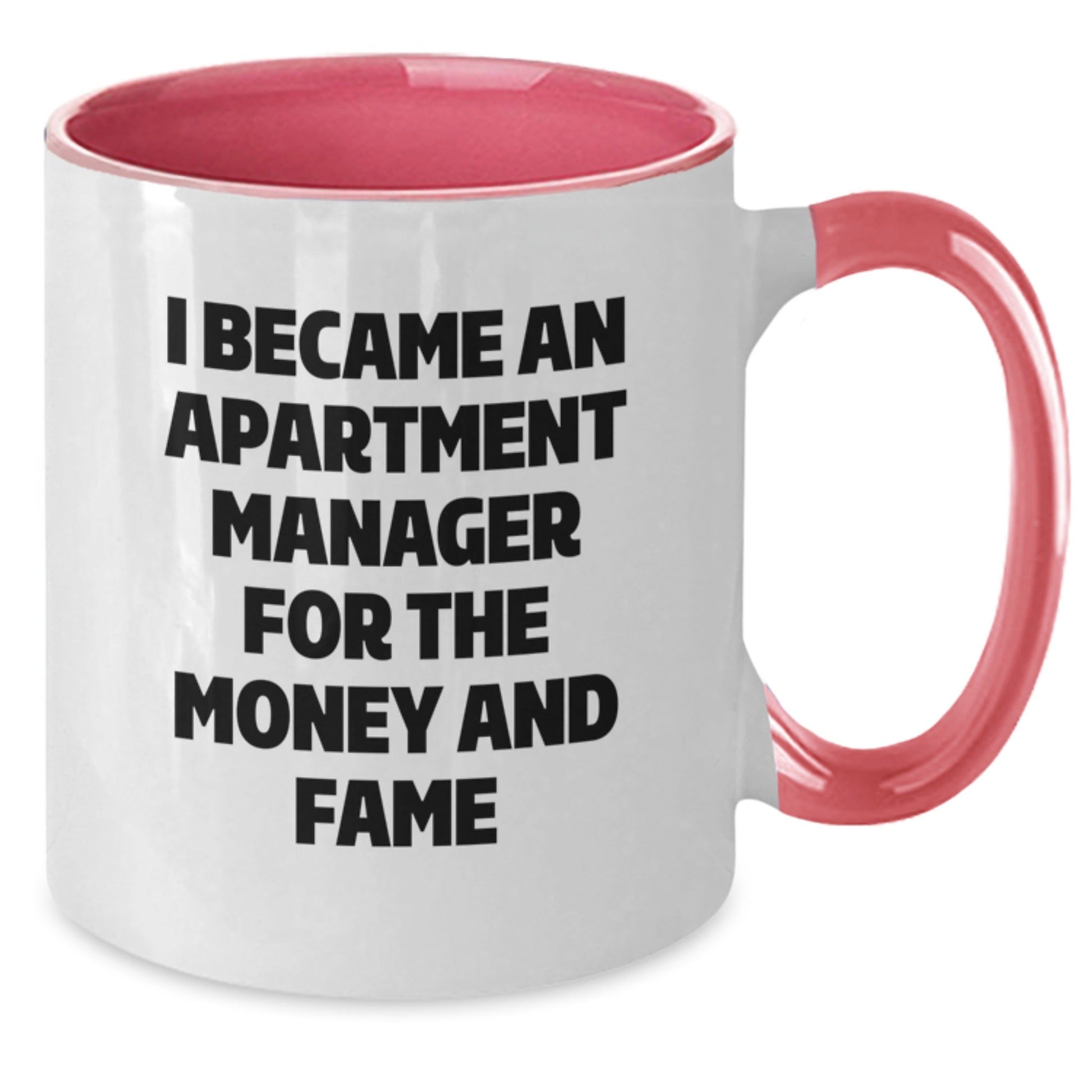 - This two-tone coffee mug is a unique and thoughtful gift for any apartment manager, featuring a funny quote that pokes fun at the idea of becoming an apartment manager for fame and fortune.