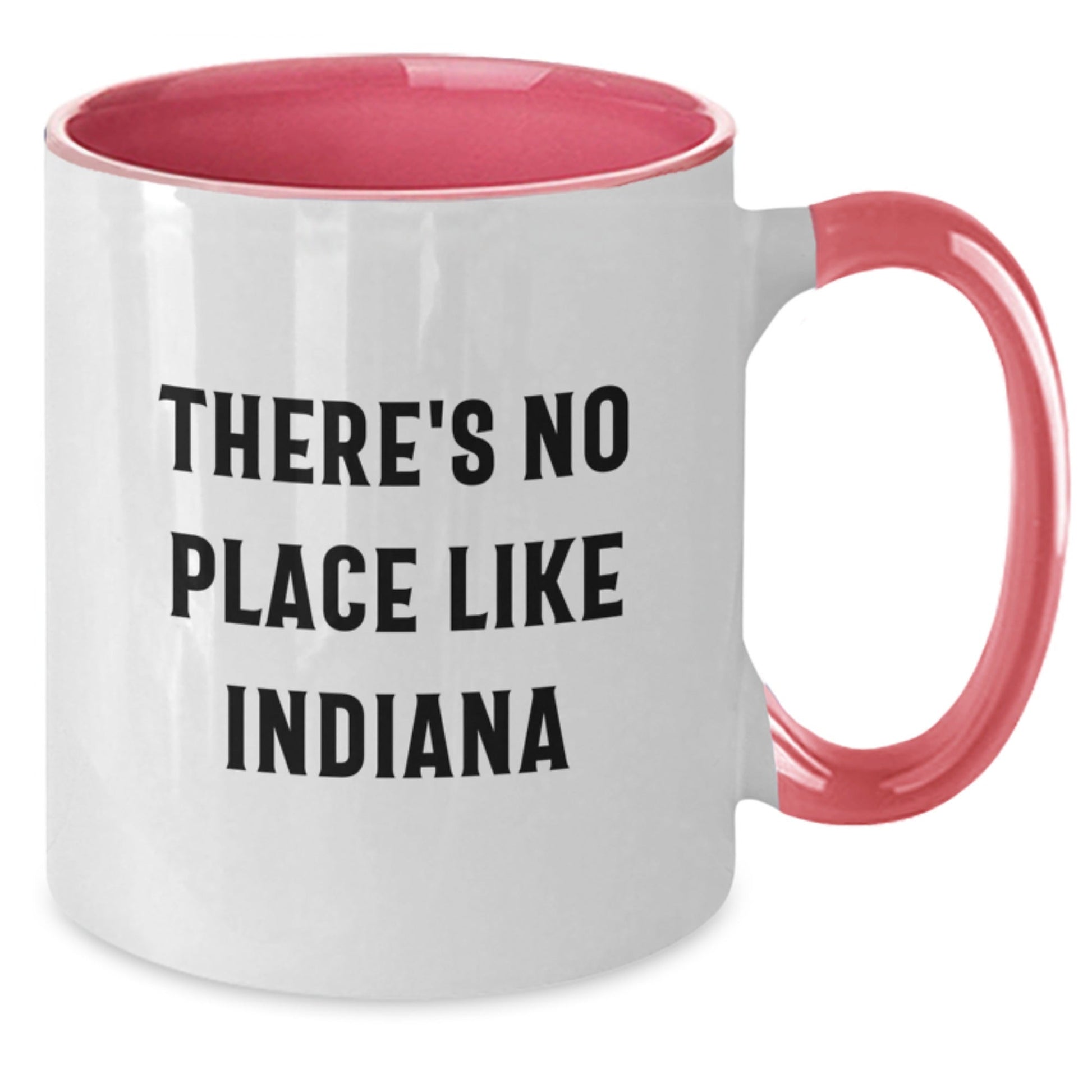 - Indulge in the Hoosier hospitality with our 'There's No Place Like Indiana' Two Tone Coffee Mug, available in four vibrant color combinations - Black and White, Red and White, Navy and White, and Pink and White - to match your unique style.