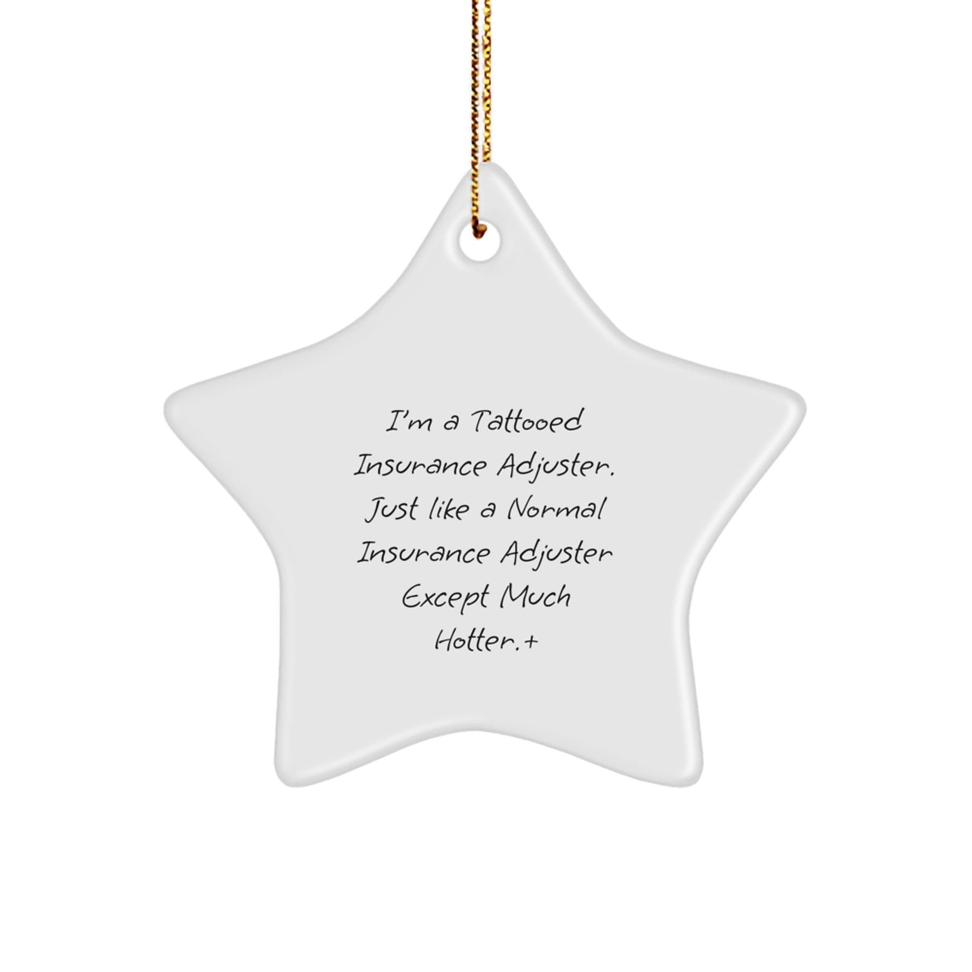 - Add some humor to their holiday decorations with this funny Insurance Adjuster star ornament, featuring the hilarious quote 'I'm A Tattooed Insurance Adjuster. Just Like A Normal Insurance Adjuster Except Much Hotter.'.