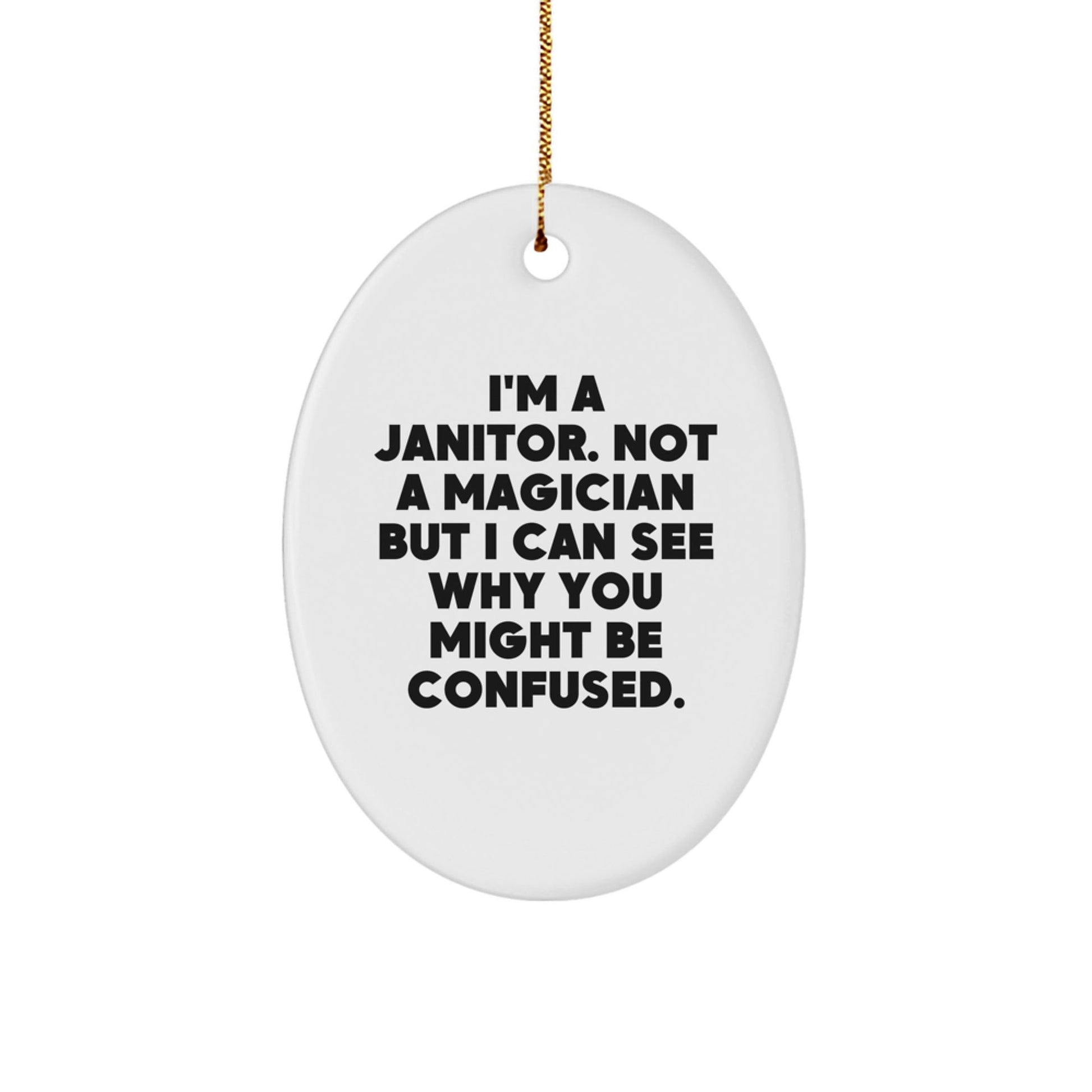 - This funny Janitor gift is a great way to show your appreciation for the hardworking janitors who keep our buildings clean and safe. With its bright, vivid colors and hilarious quote, this ornament is sure to be a hit with anyone who receives it.