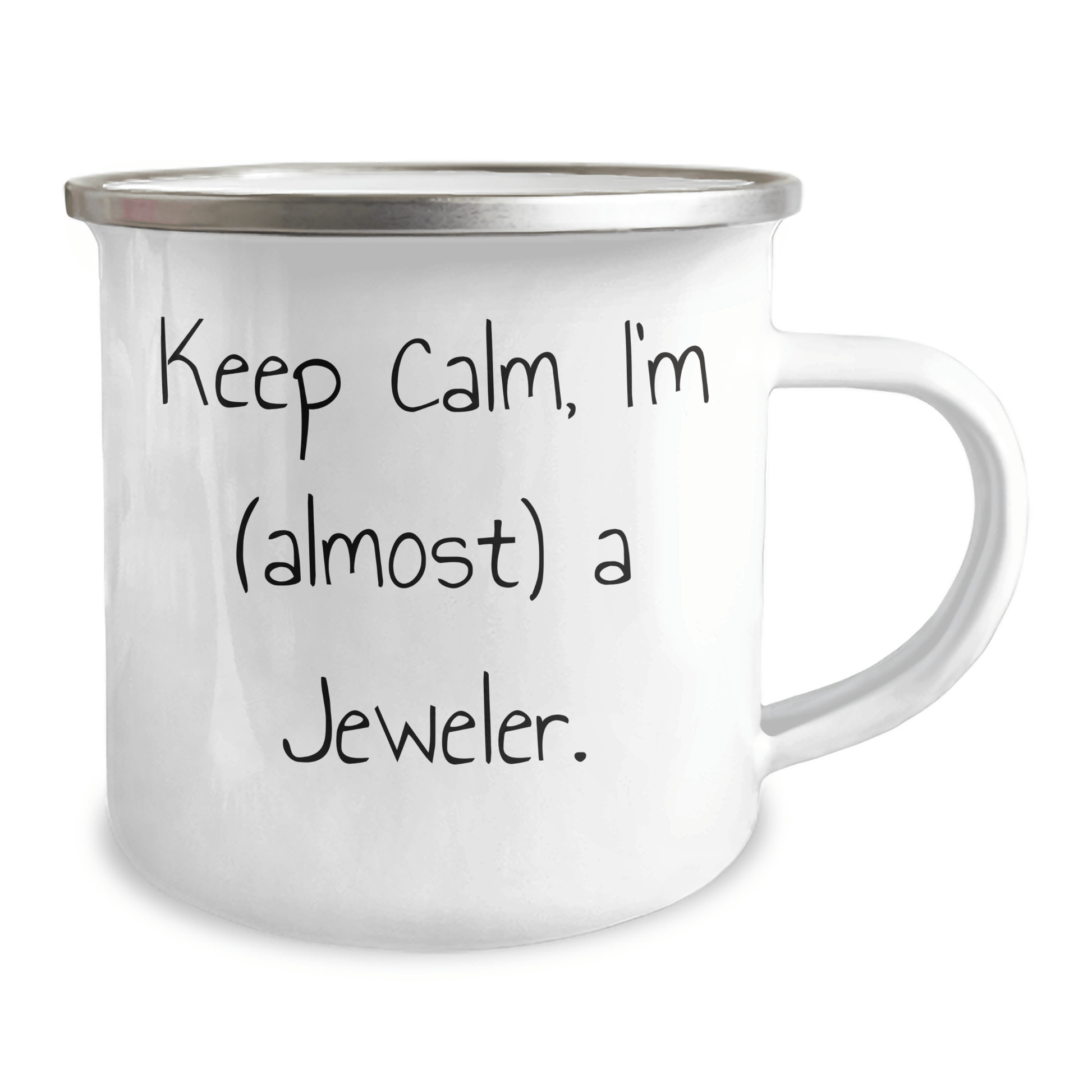• The 'Keep Calm, I'm (almost) A Jeweler' camping mug is a unique gift for any jeweler, and it's a great conversation starter. The permanent printing ensures that the design won't fade or chip, and the 12 oz capacity is perfect for a hot cup of coffee or tea. This mug is a thoughtful way to show your appreciation for a jeweler's skills and hard work.