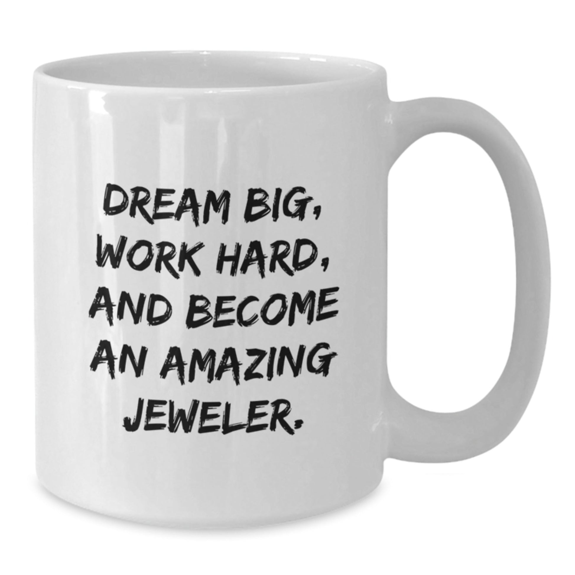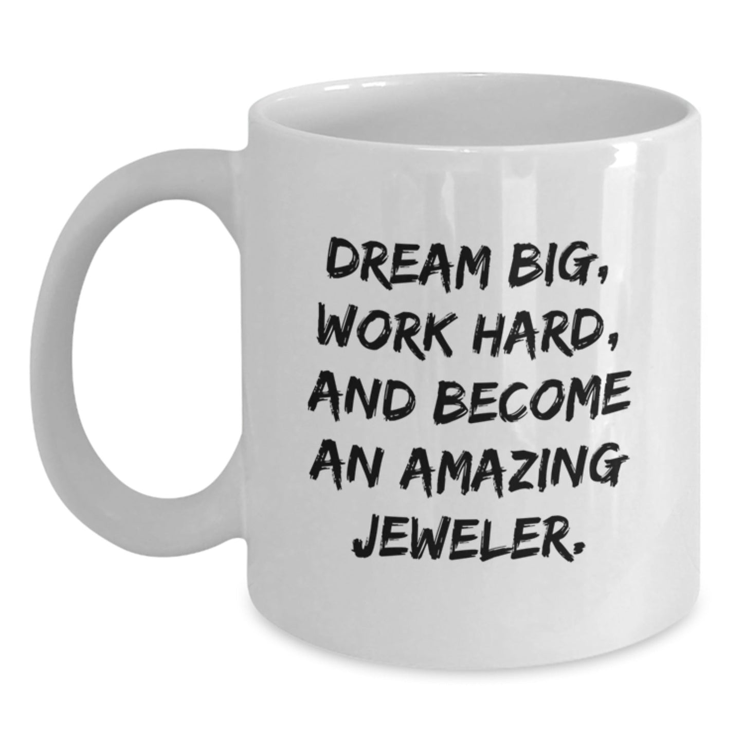 - This White Coffee Mug is a thoughtful gift for any Jeweler enthusiast or professional, featuring an inspirational quote to motivate them to 'Dream Big, Work Hard, And Become An Amazing Jeweler'.
