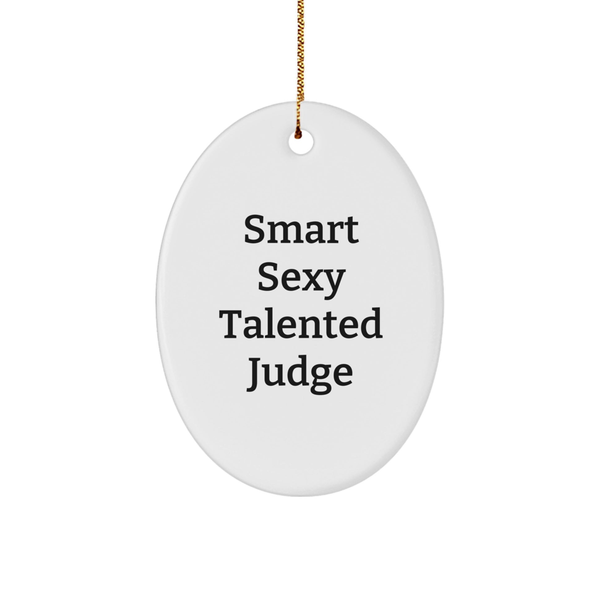 - Make a statement with this 'Smart Sexy Talented Judge' Oval Ornament, perfect for adding a touch of sophistication to your holiday decor. Its high-gloss plastic finish ensures a long-lasting design, and vibrant Sublimation printing brings the colorful judge to life.,
