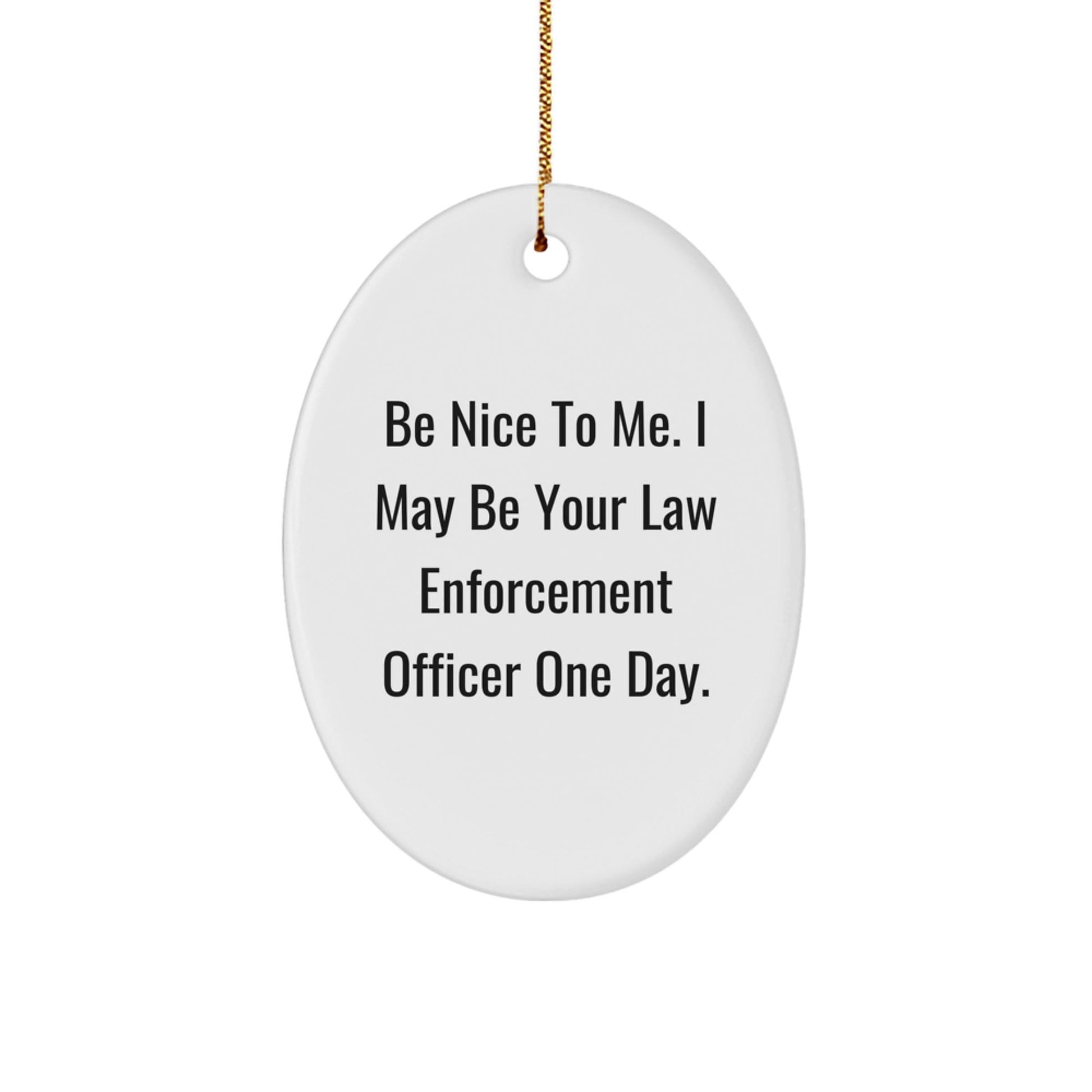 Are you looking for a unique gift for a Law Enforcement Officer in your life? Look no further! This inspirational Oval Ornament is a great way to show your appreciation for their hard work and dedication. The quote 'Be Nice To Me. I May Be Your Law Enforcement Officer One Day.' is a humorous and relatable reminder of the importance of being kind to those who serve and protect our communities.