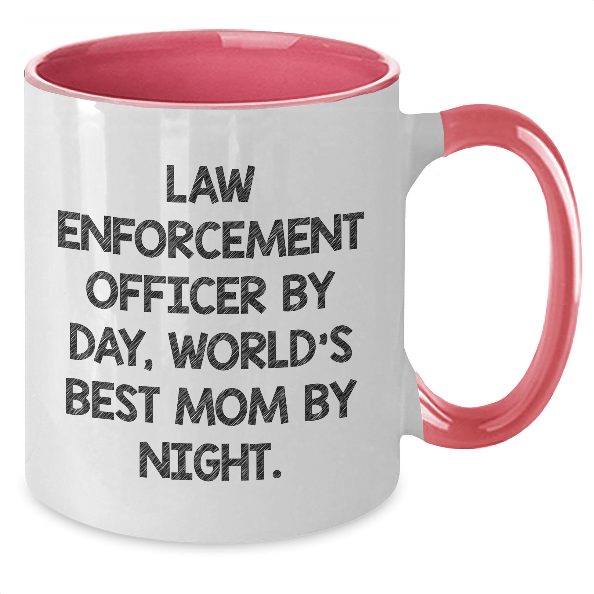 - Make a statement with this Two Tone Coffee Mug, perfect for the Law Enforcement Officer in your life. 'Law Enforcement Officer By Day, World's Best Mom By Night.' quote is a great way to express their dual roles. Durable and long-lasting, this ceramic mug is microwave and dishwasher safe, making it easy to clean and reuse.
