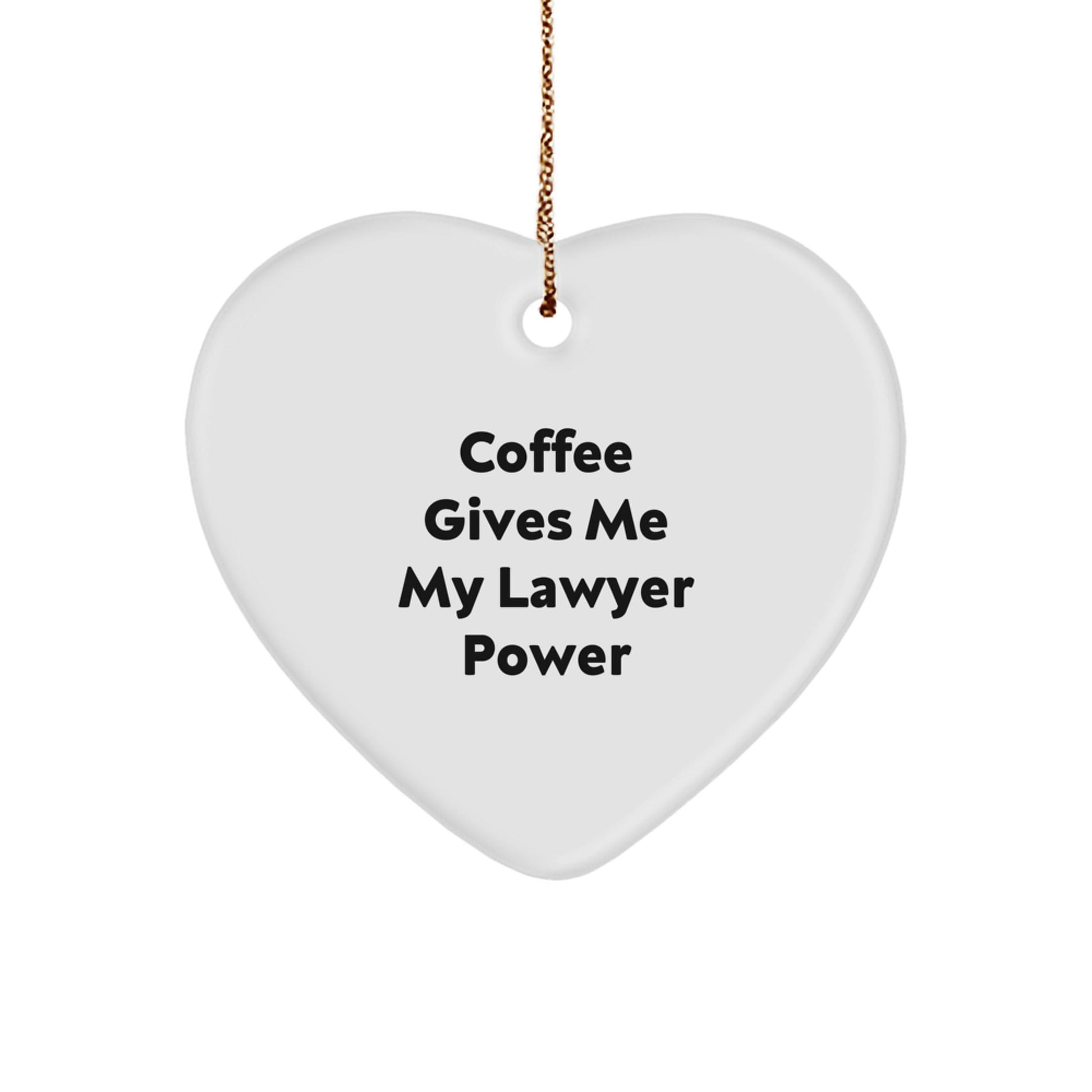 Whether you're a lawyer yourself or just appreciate the hard work of lawyers, this heart ornament is a thoughtful gift. It's perfect for lawyers of all levels, from law students to seasoned professionals. The festive gold cord makes it easy to hang on the tree or in a window. So why wait? Get your 'Coffee Gives Me My Lawyer Power' heart ornament today and make your lawyer friend's Christmas a little brighter!