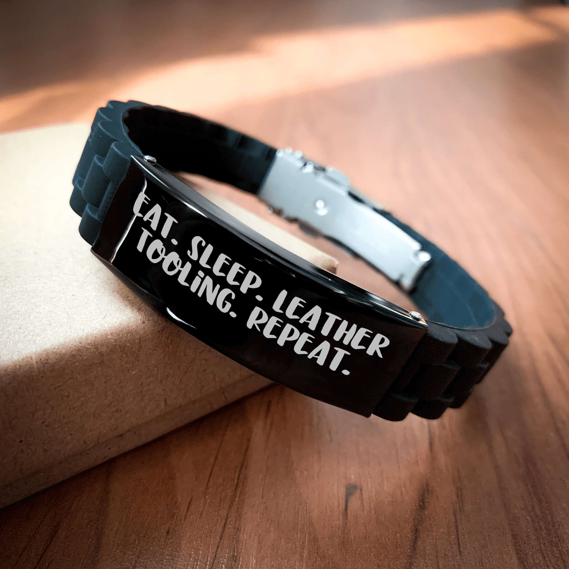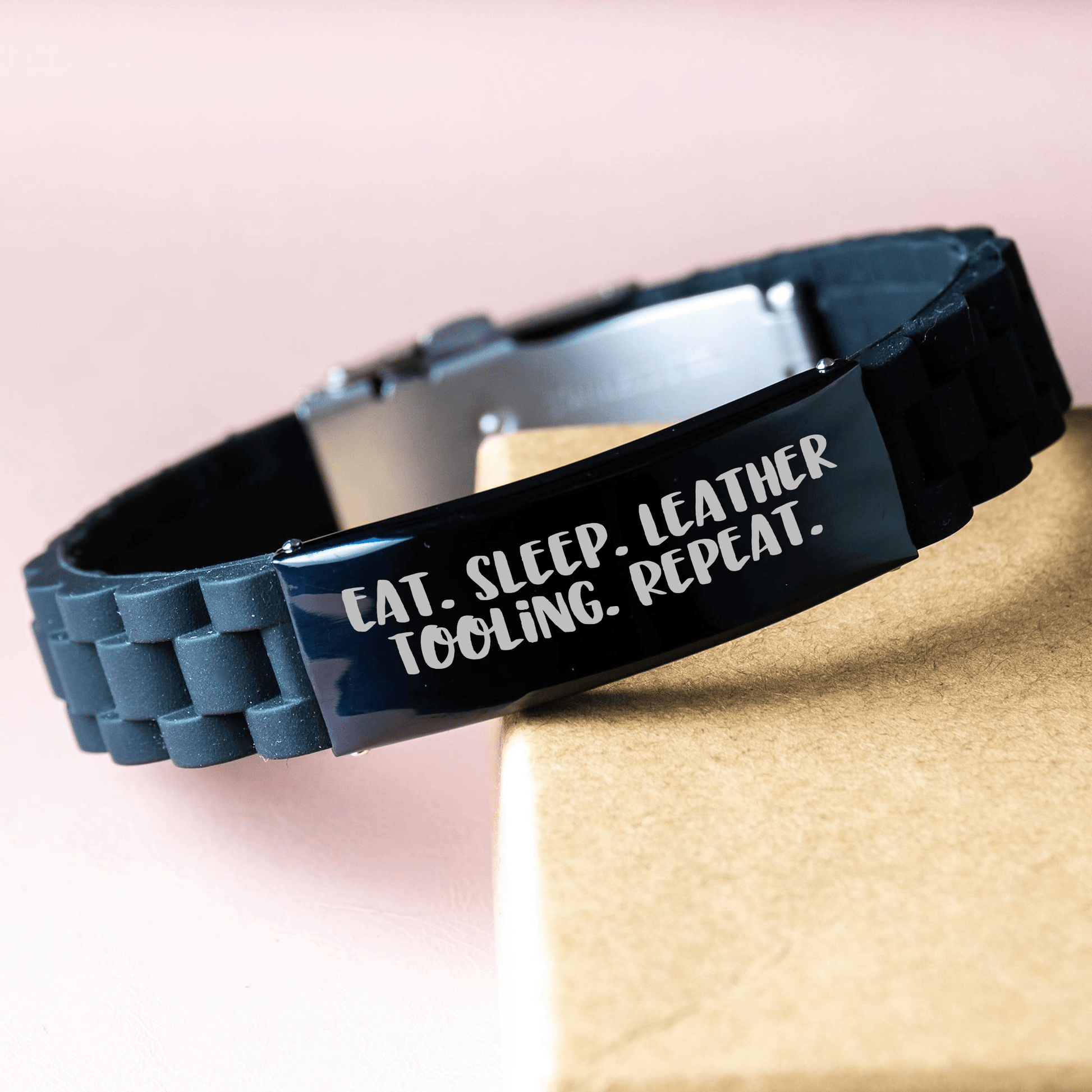 Are you a Leather Tooling enthusiast? Do you live and breathe Leather Tooling? If so, you're in the right place! Our Eat. Sleep. Leather Tooling. Repeat. Glide lock Clasp Bracelet is a must-have for any serious Leather Tooling collector or enthusiast. Made with high-quality materials, this 9.05-inch bracelet is crafted from silver, black stainless steel, and silicone, ensuring maximum resistance to rust, corrosion, and tarnishing.