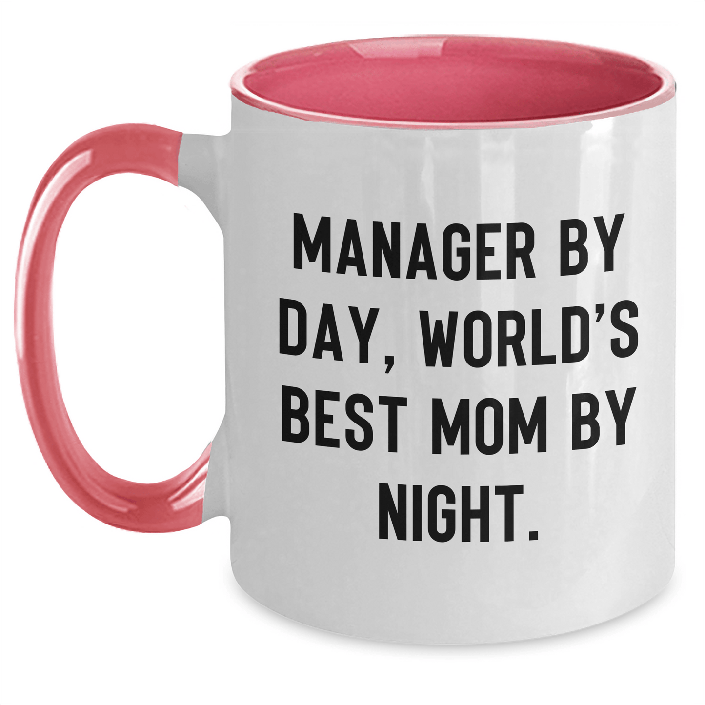 - Make a statement with this 'Manager By Day, World's Best Mom By Night.' Two Tone Coffee Mug, perfect for the manager in your life who's also a devoted mom. The two-tone design is a thoughtful touch that shows you care about their dual roles.
