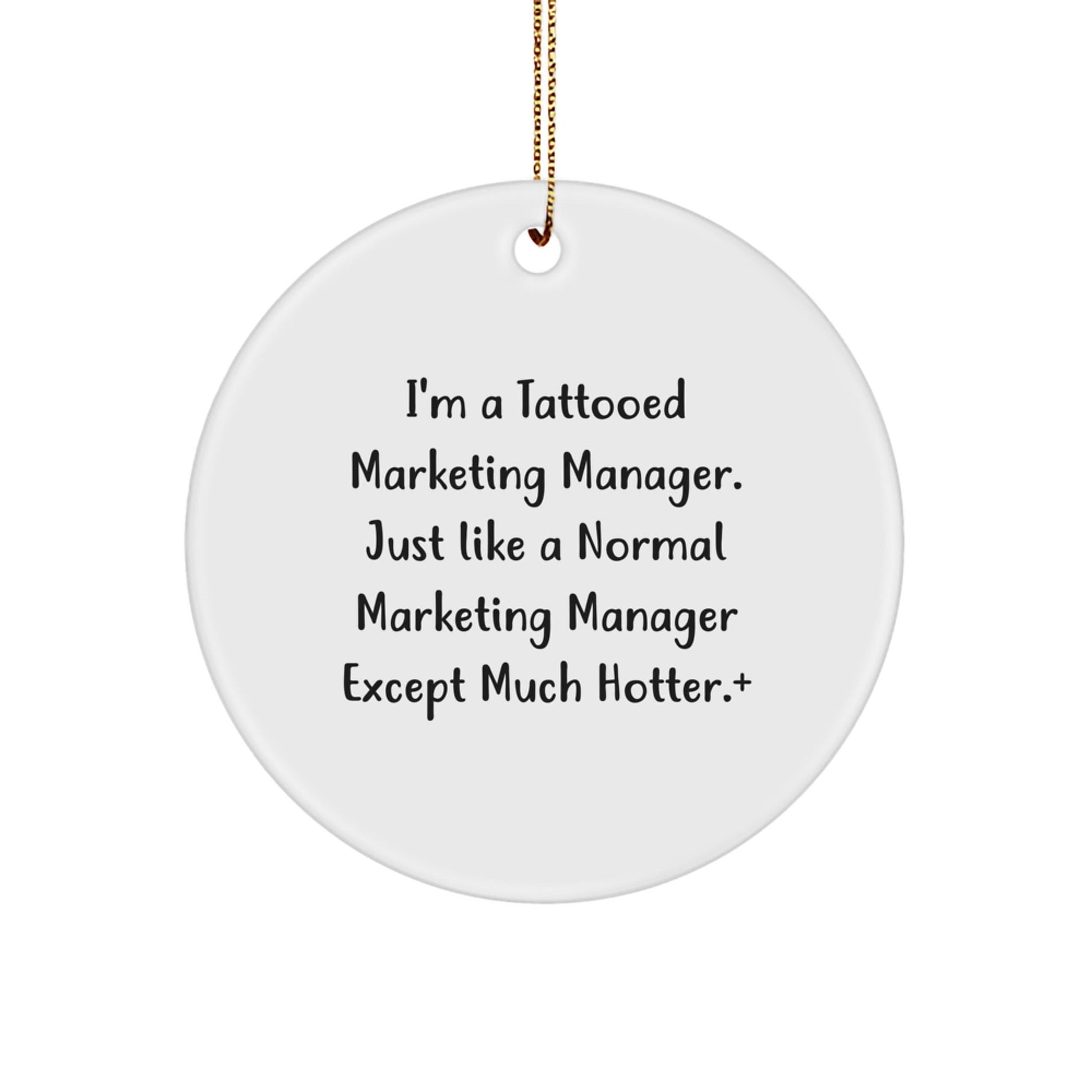 - Add a touch of humor to your office decor with this Funny Marketing Manager Circle Ornament, featuring the quote 'I'm A Tattooed Marketing Manager. Just Like A Normal Marketing Manager Except Much Hotter.'