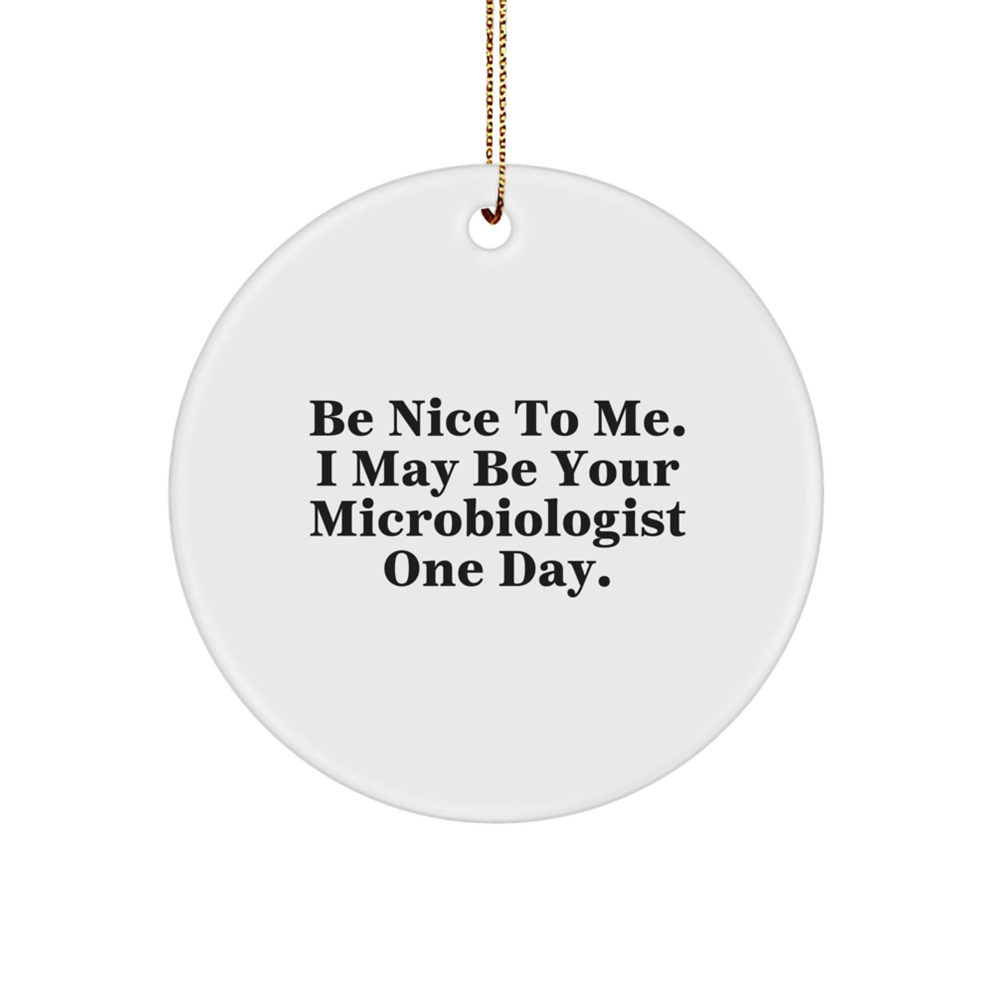Are you looking for a unique gift for a Microbiologist in your life? Look no further! This 'Be Nice To Me' Circle Ornament is a thoughtful and humorous way to show your appreciation for their hard work and dedication. Made from sturdy MDF with a high-gloss finish, this ornament is lightweight and resistant to breaking, making it perfect for households with children or pets. The vibrant colors and festive gold cord will add a touch of warmth and elegance to your holiday decor. Whether you're a family member, friend, or coworker, this gift is sure to bring a smile to their face. So why wait? Order this Microbiologist Circle Ornament today and show your loved one you care!