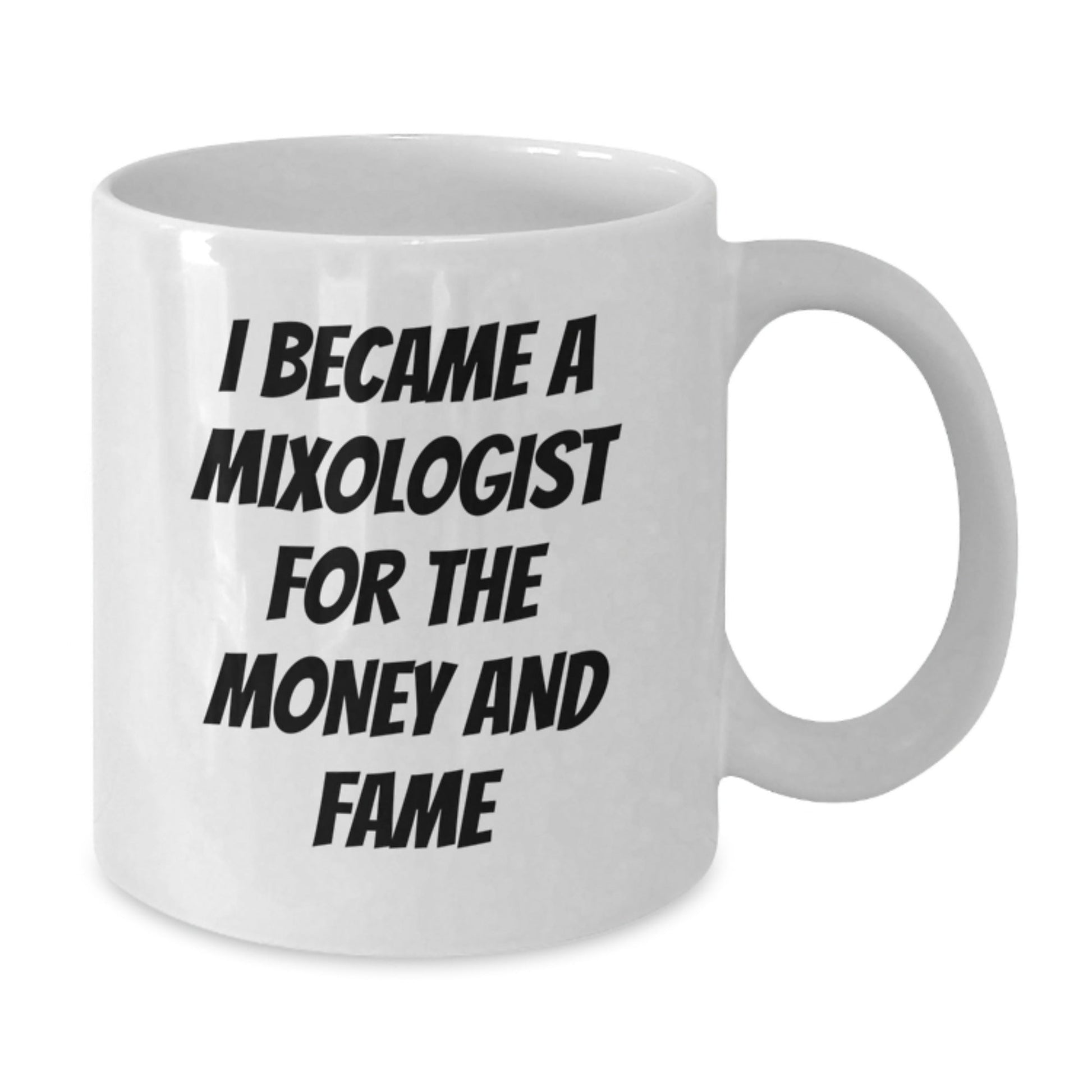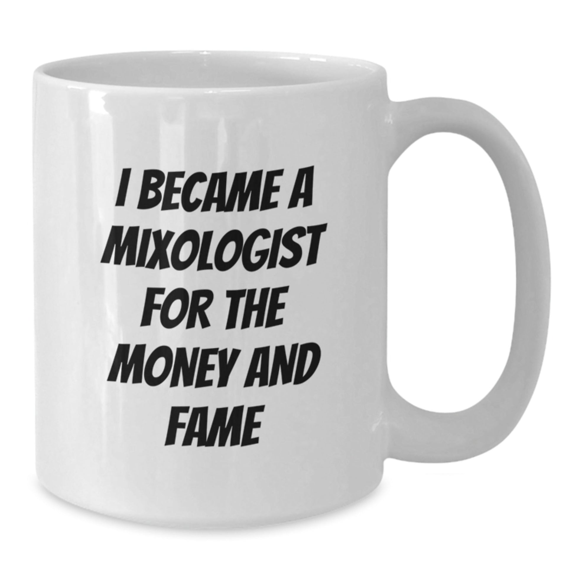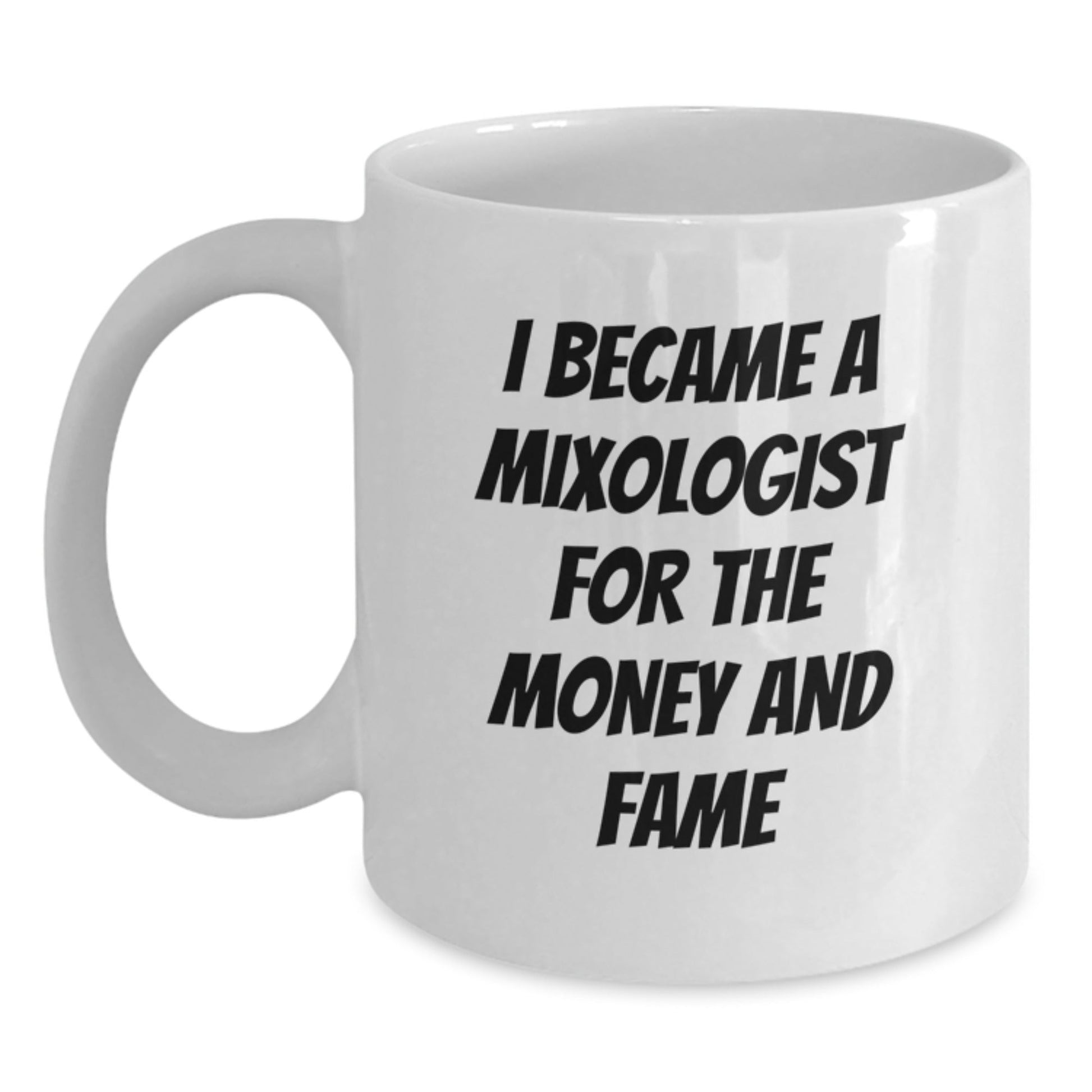 - The 'I Became A Mixologist For The Money And Fame' quote on this white coffee mug is a humorous take on the mixology profession. Whether you're a working mixologist or just a fan of the craft, this mug is a great way to showcase your personality and add a touch of humor to your daily routine.