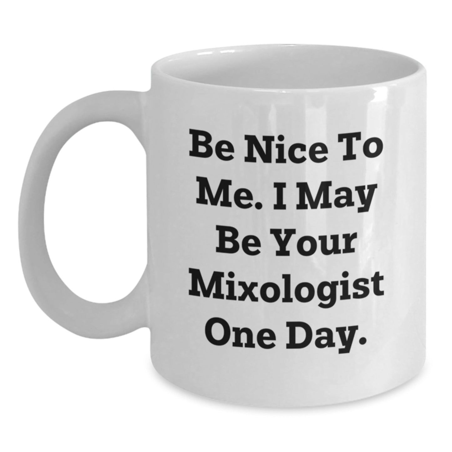 "keywords": "mixologist, white coffee mug, funny, gifts from friends, gifts for new grad, graduation, be nice to me, i may be your mixologist one day, ceramic, microwave safe, dishwasher safe, coffee lover, gift for coworker, gift for family member, gift for friend