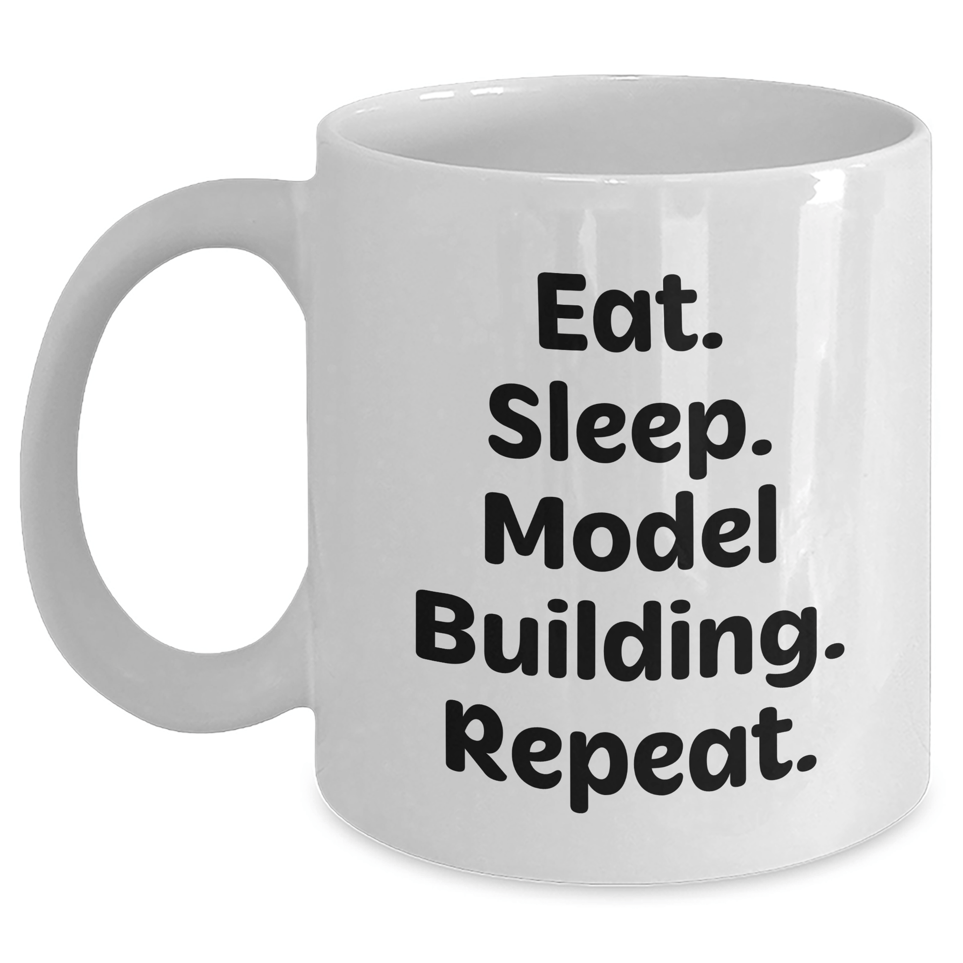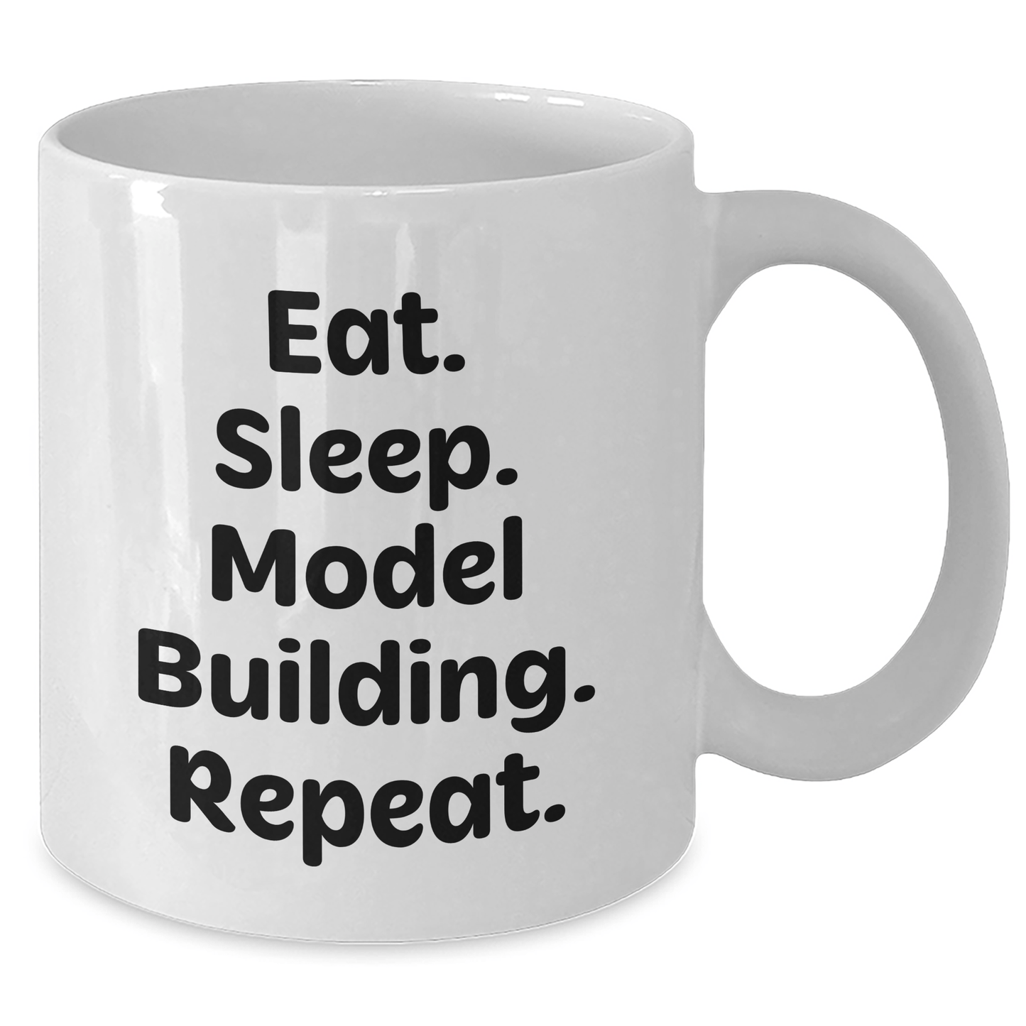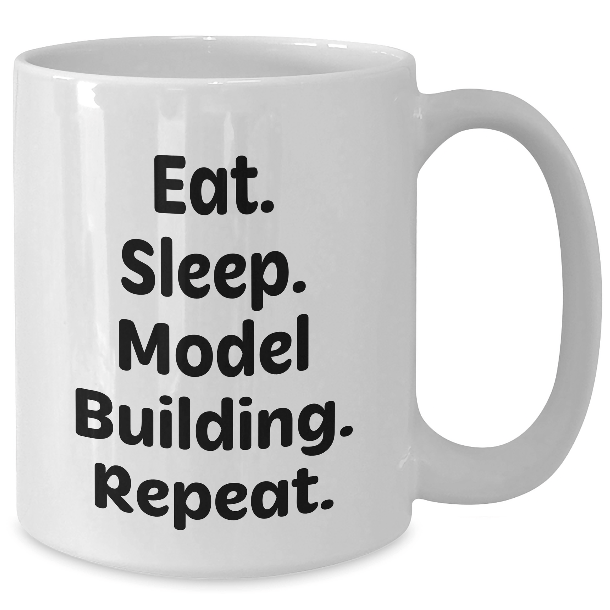 Are you a model building enthusiast or looking for a unique gift for a fellow model builder? Look no further! This funny white coffee mug is perfect for anyone who loves model building as much as they love their morning coffee. With its hilarious quote, 'Eat. Sleep. Model Building. Repeat.', this mug is sure to bring a smile to any model builder's face. It's a thoughtful gift for friends, family, or coworkers who share your passion for model building. Whether you're a seasoned pro or just starting out, this mug is a great way to show off your love for model building. The ceramic mug is microwave and dishwasher safe, making it easy to clean and use. So why wait? Get this funny model building gift for him today and make his day a little brighter!