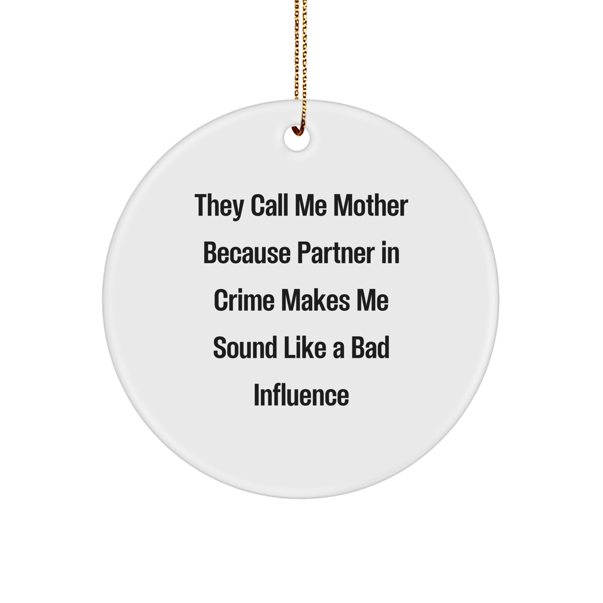Are you looking for a unique and funny Christmas gift for your mother? Do you want to surprise her with a thoughtful and humorous ornament that reflects her personality? Look no further! Our 'They Call Me Mother Because Partner In Crime Makes Me Sound Like A Bad Influence' Circle Ornament is the ideal gift for the mother in your life.