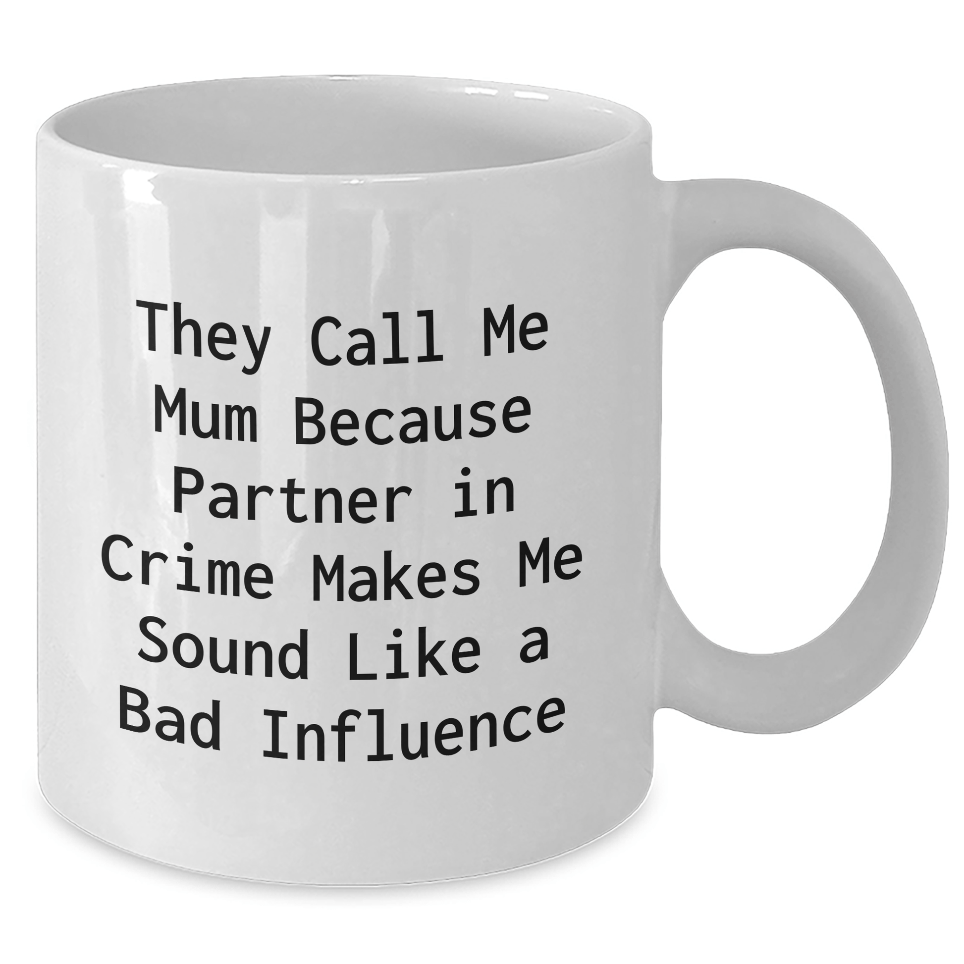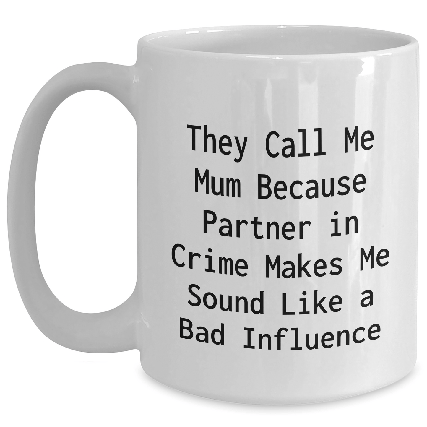 - Mums will love this thoughtful gift on Father's Day, featuring the quote 'They Call Me Mum Because Partner In Crime Makes Me Sound Like A Bad Influence' in a fun and playful way. This white coffee mug is perfect for sipping morning coffee or tea, and its 11oz or 15oz capacity ensures you can enjoy your favorite beverage without having to worry about running out.