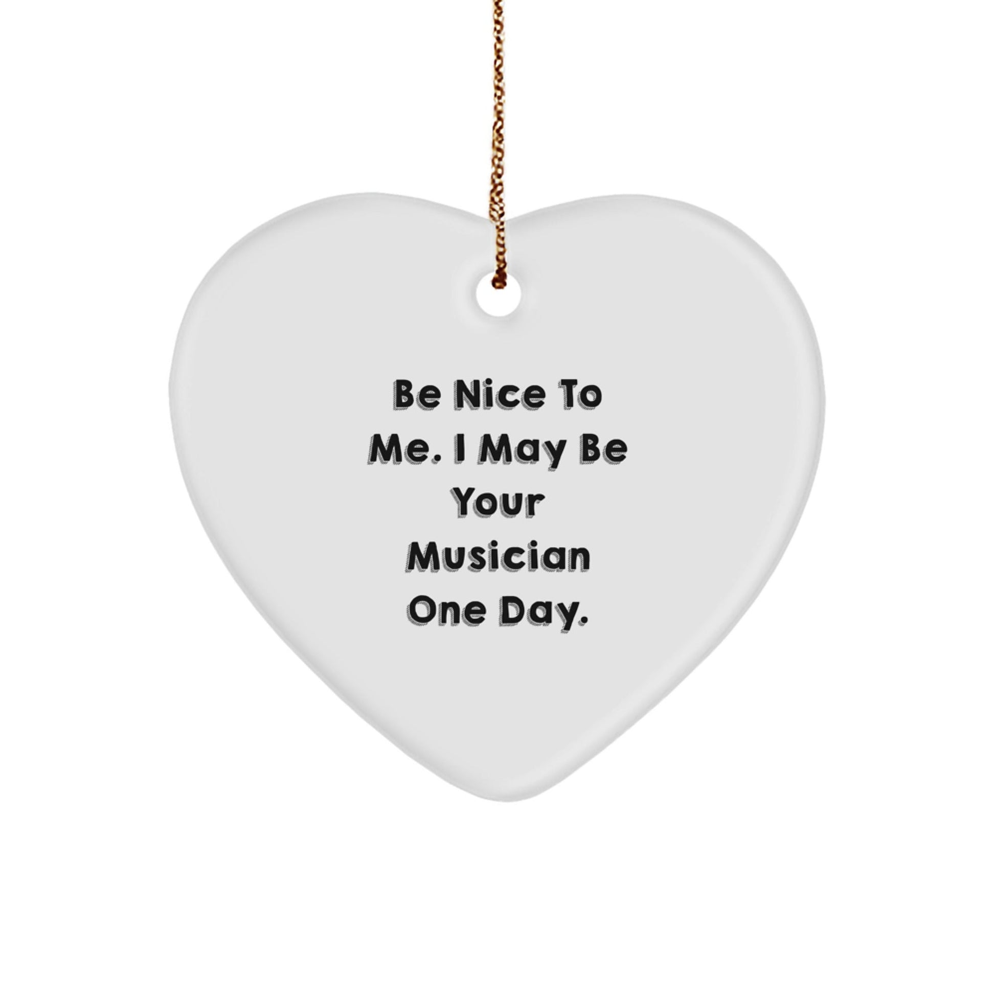 - This heart-shaped ornament is the ideal gift for musicians and music enthusiasts, featuring the quote 'Be Nice To Me. I May Be Your Musician One Day.' in a fun and playful font.