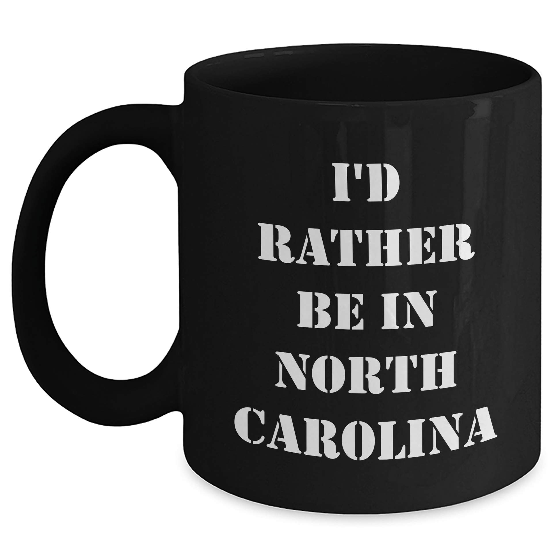 Are you a North Carolina enthusiast or looking for a unique gift for someone who loves the Tar Heel State? This funny black coffee mug is the perfect way to show your pride. The quote 'I'd Rather Be In North Carolina' is a humorous way to express your love for the state. Whether you're giving it as a gift to a friend, coworker, or family member, they'll appreciate the thought and humor.
