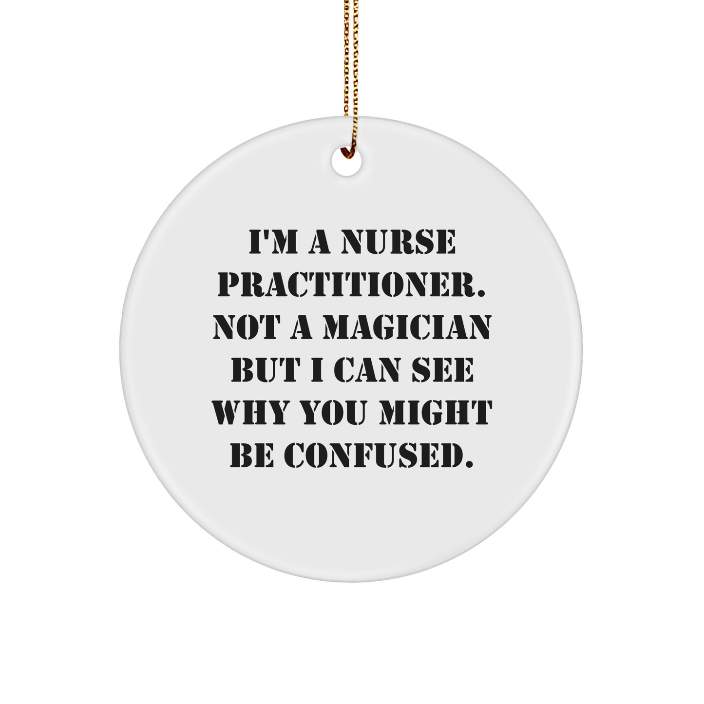 Give the gift of laughter and appreciation with this 'I'm A Nurse Practitioner. Not A Magician But I Can See Why You Might Be Confused.' Circle Ornament. Don't miss out and get ready to make their Christmas a little brighter!