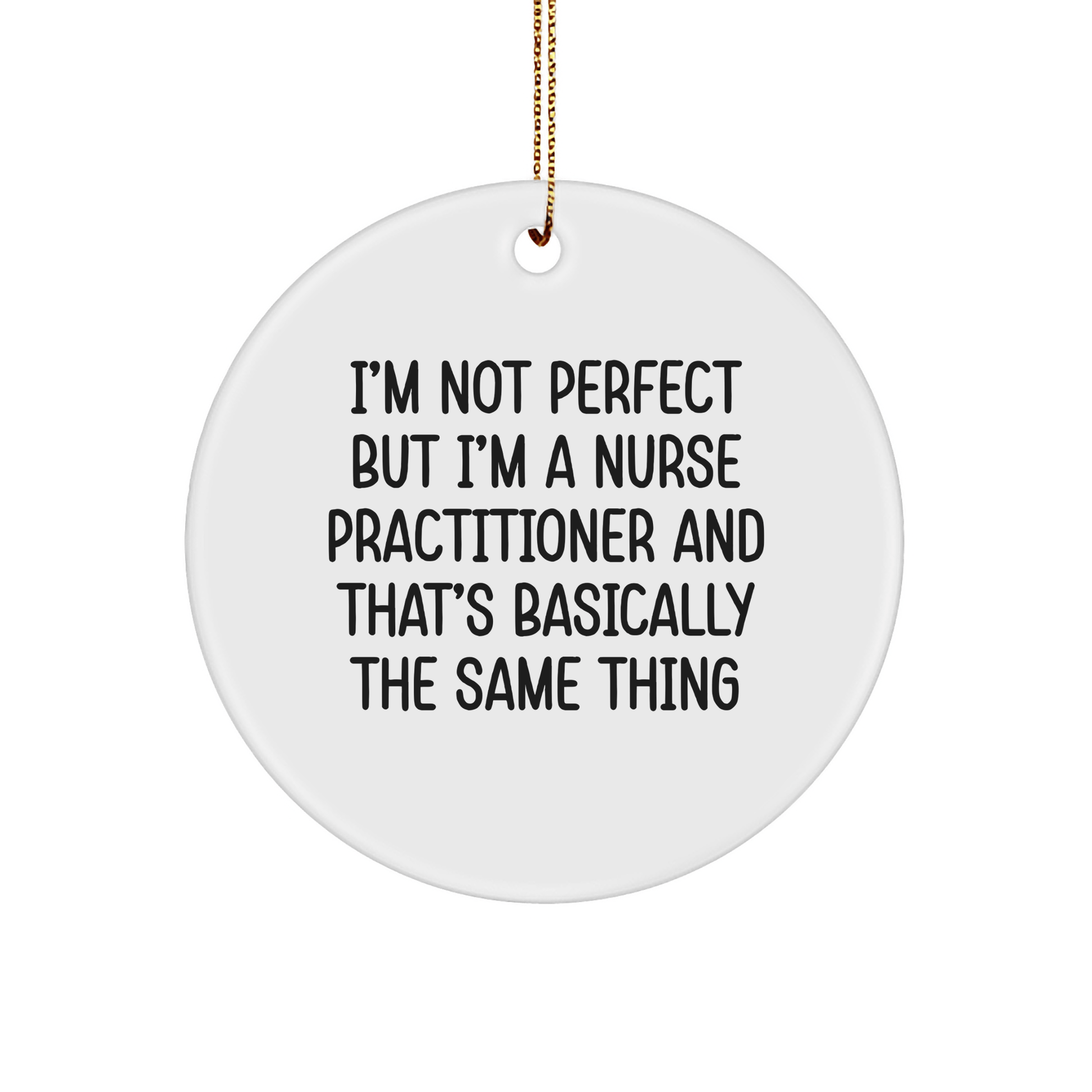 If you're looking for a unique and hilarious gift for a Nurse Practitioner, look no further! This Circle Ornament is a must-have for any NP enthusiast. With its vibrant and funny quote, 'I'm Not Perfect But I'm A Nurse Practitioner And That's Basically The Same Thing', this gift is sure to bring a smile to their face. The ideal gift for a Nurse Practitioner's Christmas celebration, this ornament is crafted from sturdy MDF with a high-gloss plastic finish, making it a long-lasting and eye-catching addition to any room. The lightweight and resistant design also makes it a great choice for households with children or pets. Plus, it ships with a festive gold cord for easy hanging. Whether you're a friend, coworker, or family member, this gift is sure to be a hit with any Nurse Practitioner on your list. So why wait? Get this Circle Ornament today and make their Christmas a little brighter!
