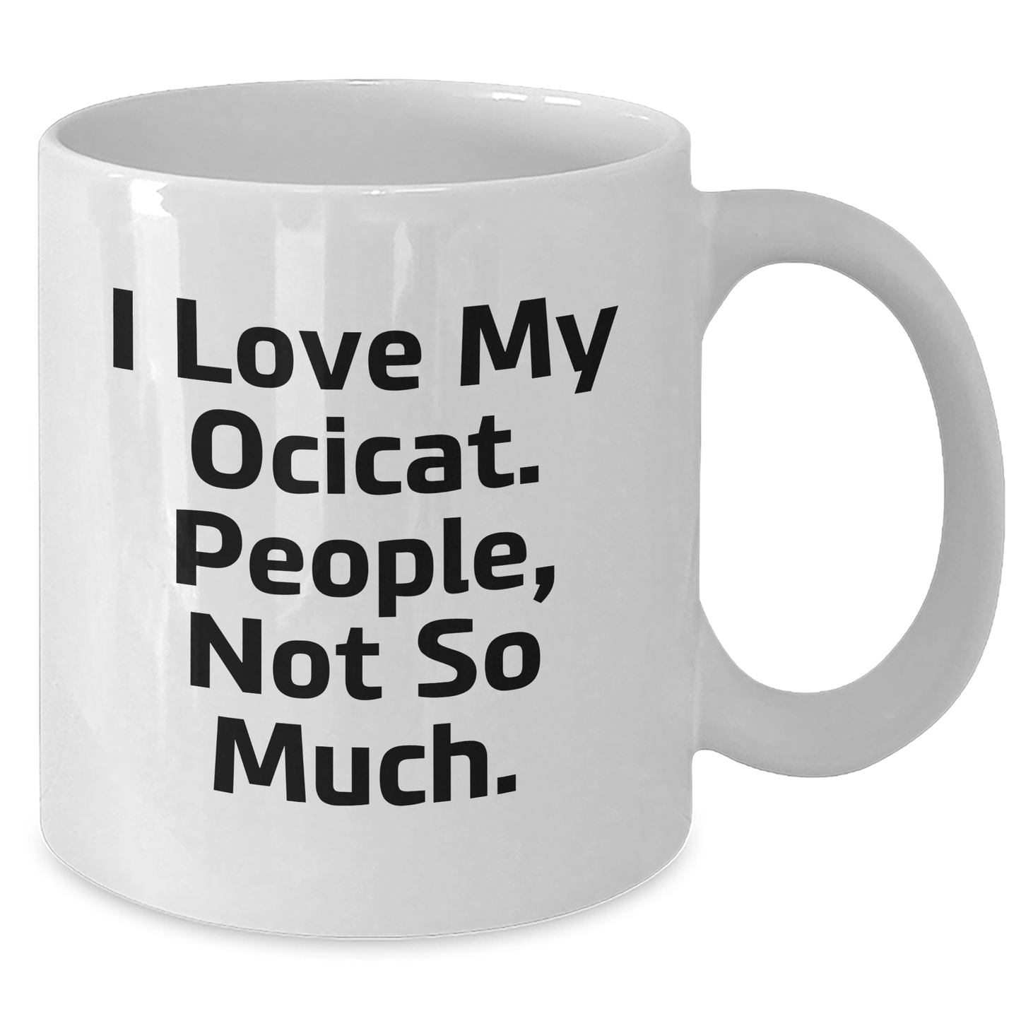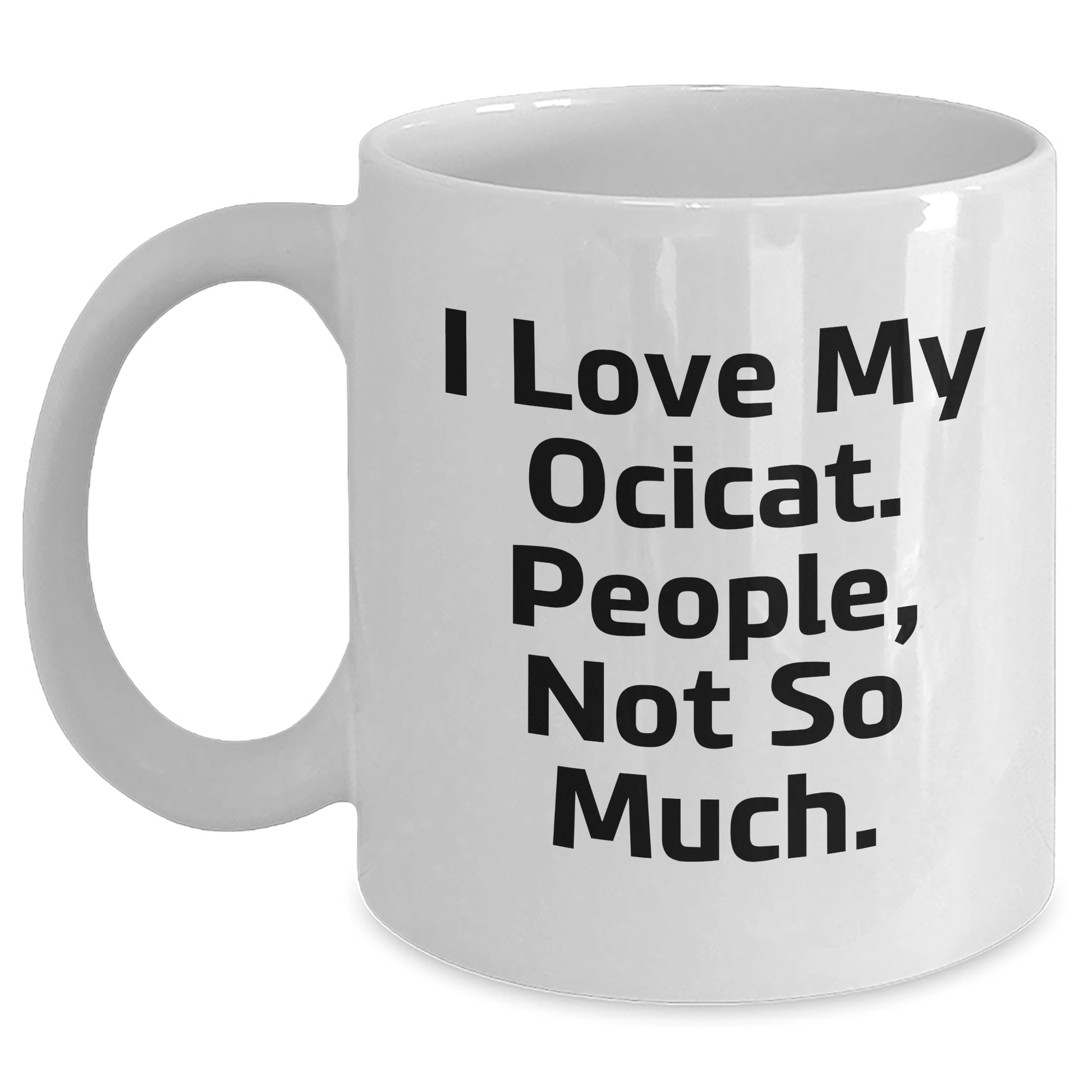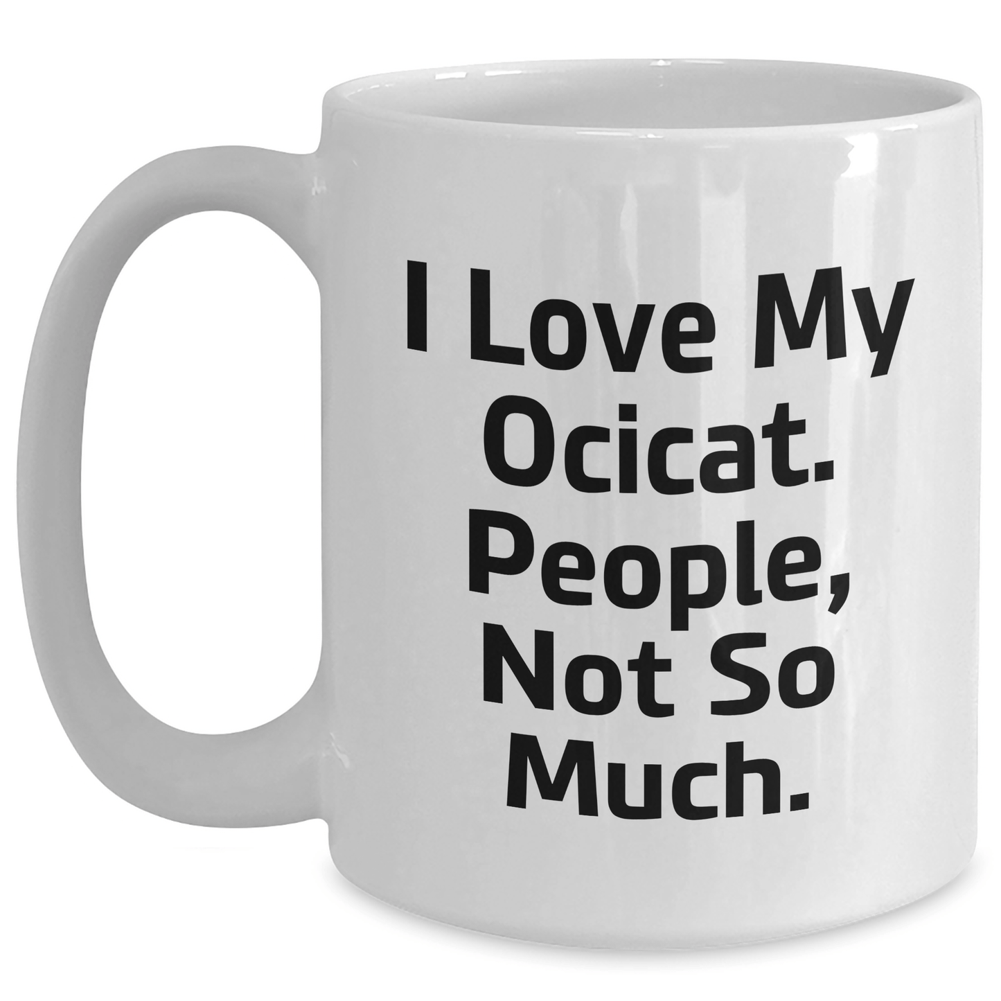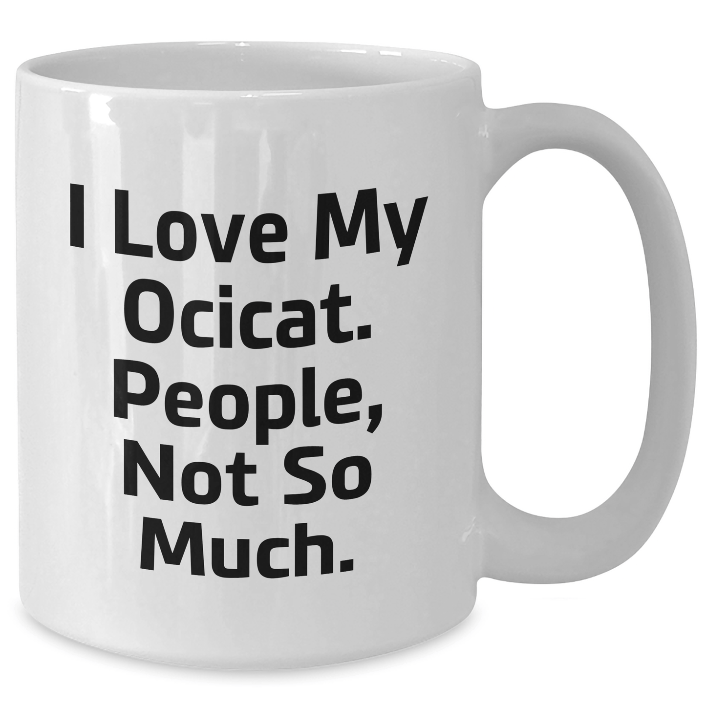 Get ready to delight any Ocicat enthusiast or Father's Day gift-giver with this hilarious quote on a white ceramic coffee mug. 'I Love My Ocicat. People, Not So Much.' is a funny take on the joys of owning an Ocicat, and this mug is the purrfect way to share that love. Perfect for coffee lovers, pet owners, and family members alike, this unique gift will bring a smile to anyone's face. Whether you're a friend, family member, or coworker, this mug is a thoughtful and humorous way to show your affection. Make someone's day with this funny Ocicat quote coffee mug, a Father's Day gift that's sure to be cherished.