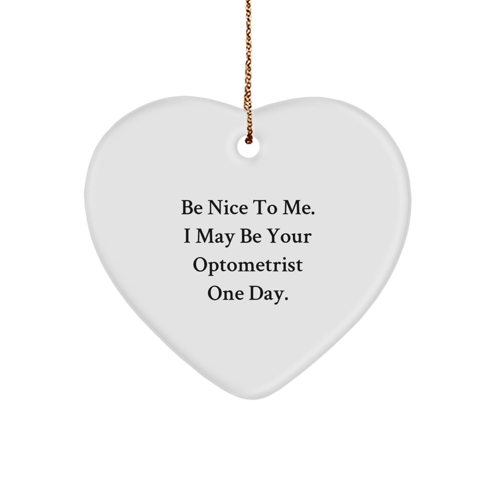 Get ready to make your friends and family laugh with this funny heart ornament! As an optometrist, you know how important it is to be nice to those around you. This quote says it all: 'Be Nice To Me. I May Be Your Optometrist One Day.' This heart-shaped ornament is the ideal gift for any optometrist or anyone who loves a good laugh. It's made from sturdy MDF with a high-gloss plastic finish, ensuring it will last for years to come. The vibrant colors and festive gold cord make it easy to hang and decorate your home or office. Whether you're looking for a unique gift for your favorite optometrist or just want to add some humor to your holiday decor, this ornament is sure to bring a smile to your face. So why not spread some joy this holiday season with this funny heart ornament? It's the perfect way to show your appreciation for those around you.
