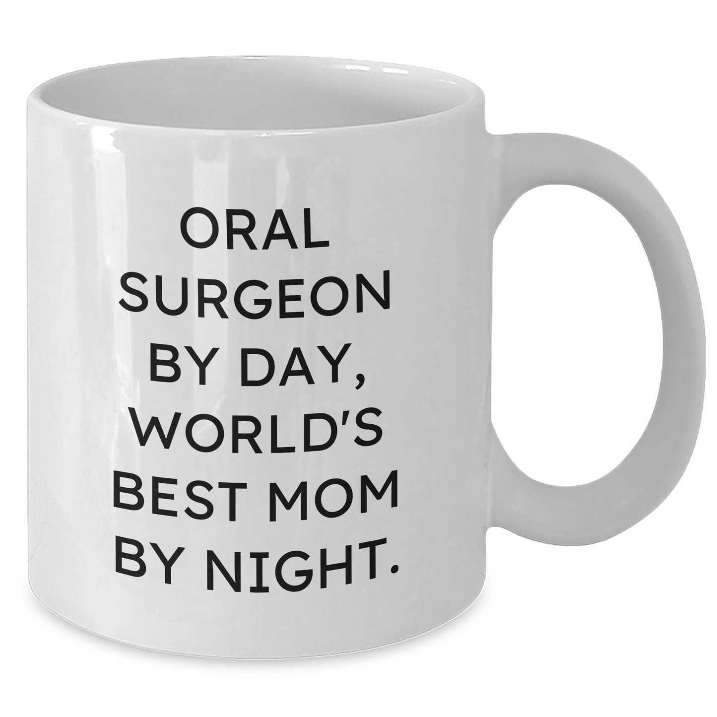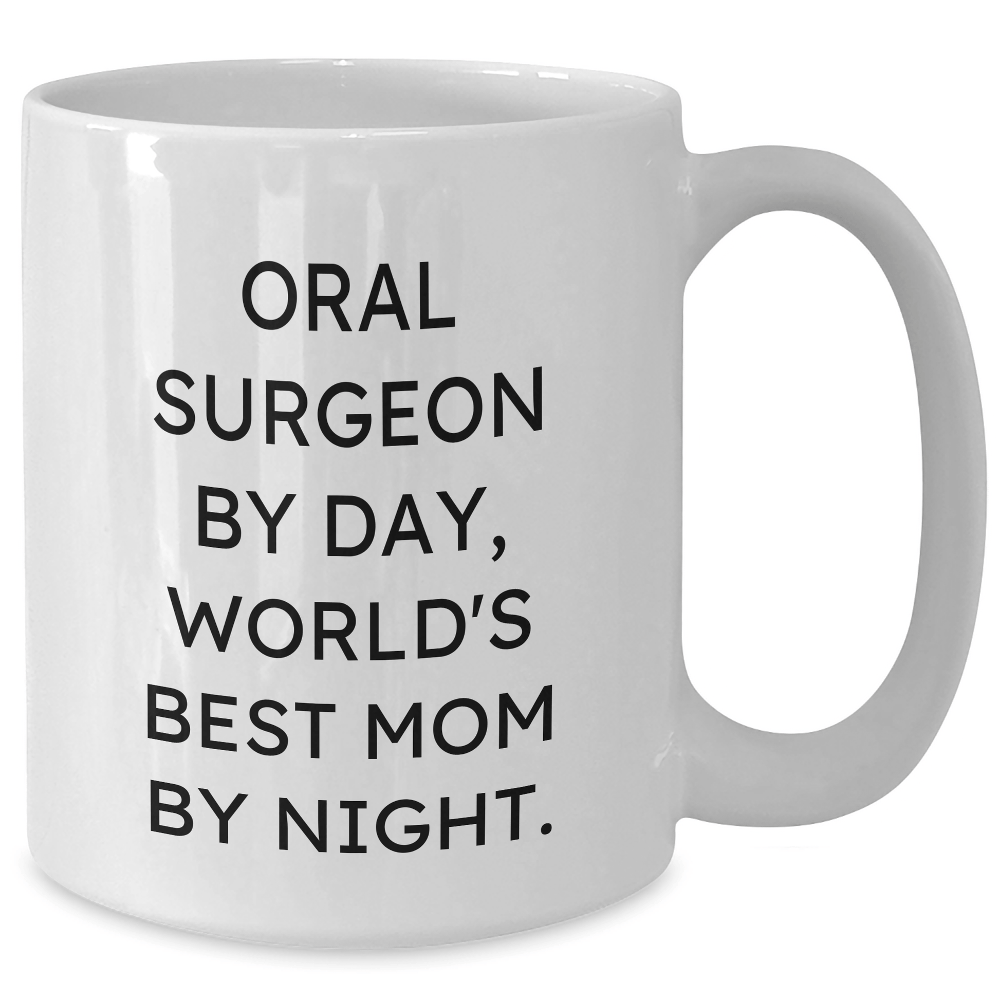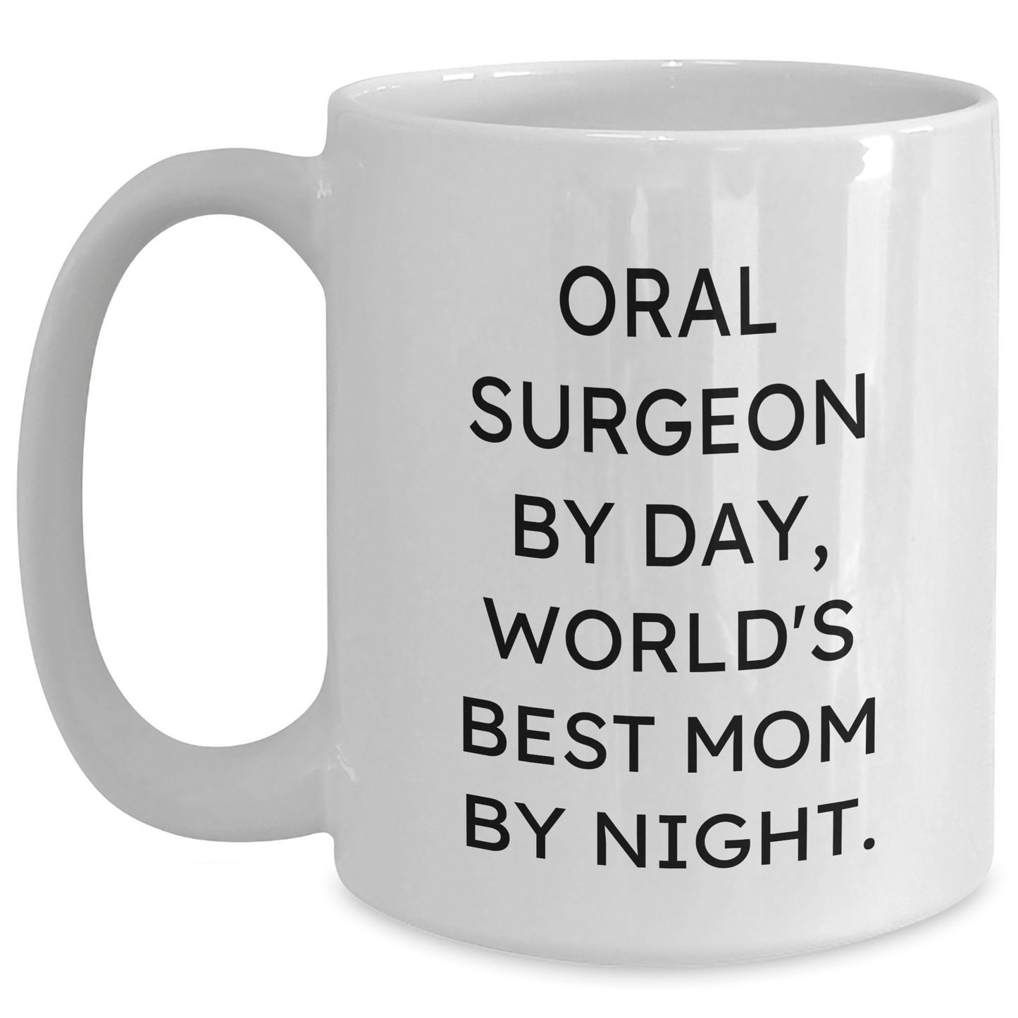 - This funny white coffee mug is the perfect way to show your appreciation for the oral surgeon in your life, with the quote 'Oral Surgeon by Day, World's Best Mom by Night' on one side and a blank space for your personalized message on the other.