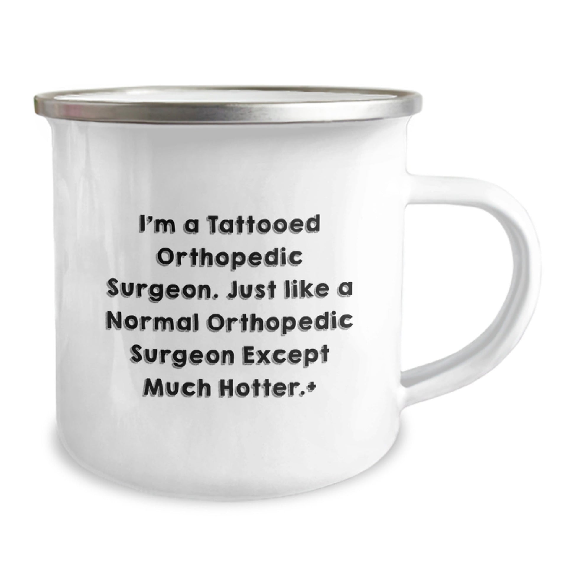 Celebrate the graduation of an Orthopedic Surgeon with a unique gift that stands out from the crowd! This funny camping mug features a quote that will make anyone laugh: 'I'm A Tattooed Orthopedic Surgeon. Just Like A Normal Orthopedic Surgeon Except Much Hotter.' Perfect for Orthopedic Surgeon enthusiasts or as a graduation gift for friends, family, or coworkers. Made of stainless steel with enamel finish, this 12 oz mug is sturdy and easy to clean. Hand washing with mild detergent is recommended. The permanent printing will not fade after washing, ensuring the humor and wit of the quote remain intact. Give the gift of laughter and memories with this one-of-a-kind Orthopedic Surgeon camping mug. For the graduates and Orthopedic Surgeons who appreciate humor and a great story, this mug is the perfect way to show your appreciation. Whether you're a friend, family member, or coworker, this gift is sure to be a hit. So why wait? Get your Orthopedic Surgeon camping mug today and make a statement!
