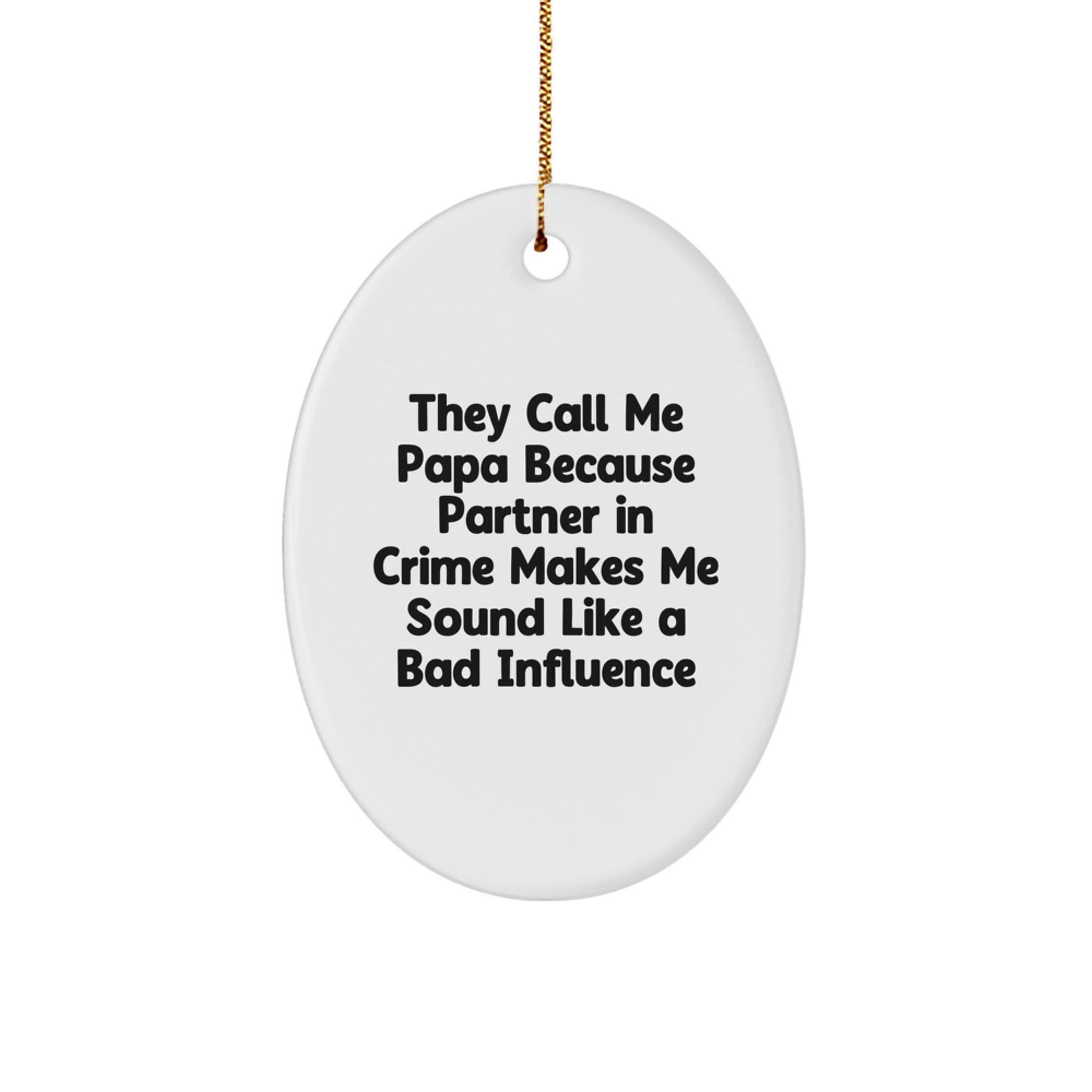 - This Oval Ornament is a funny and unique gift for Papa, featuring the quote 'They Call Me Papa Because Partner In Crime Makes Me Sound Like A Bad Influence'. It's a reminder of the importance of family and friendship. The Oval Ornament is crafted from sturdy MDF with a high-gloss plastic finish, ensuring it will last for years to come.
